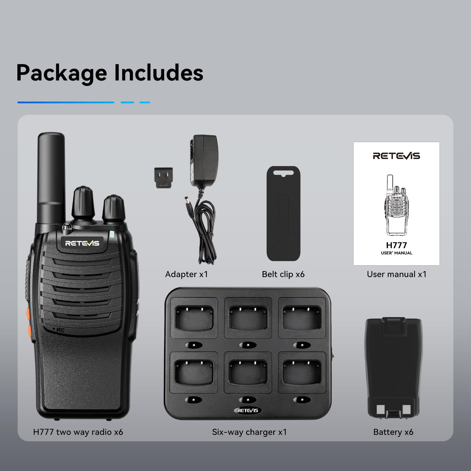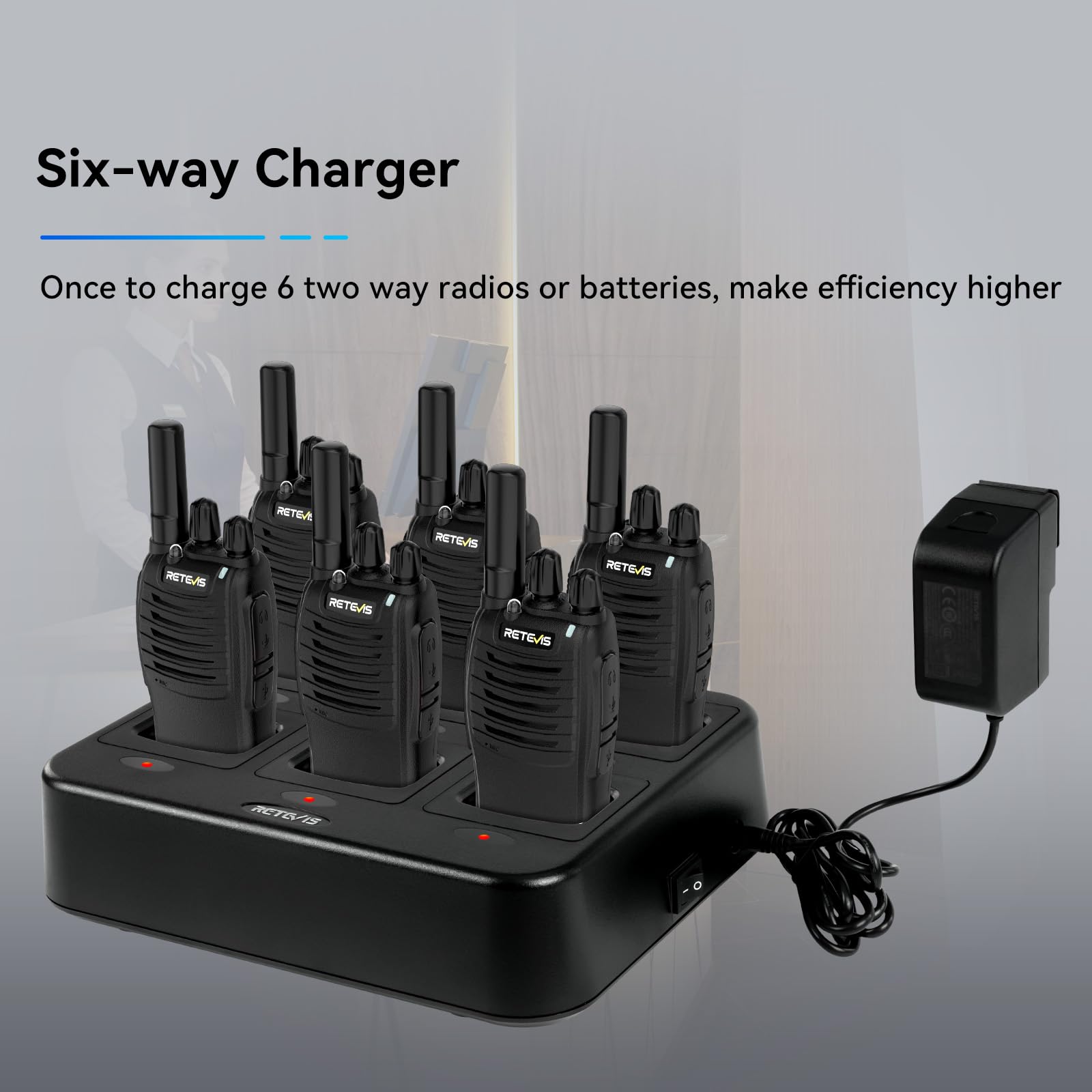 【6 Way Multi Gang Charger】H-777 walkie talkies with 6-way gang charger can charge six radios or six batteries at the same time; with multiple safety charging protections; you don’t have to worry about charging overnight; saving you time and space