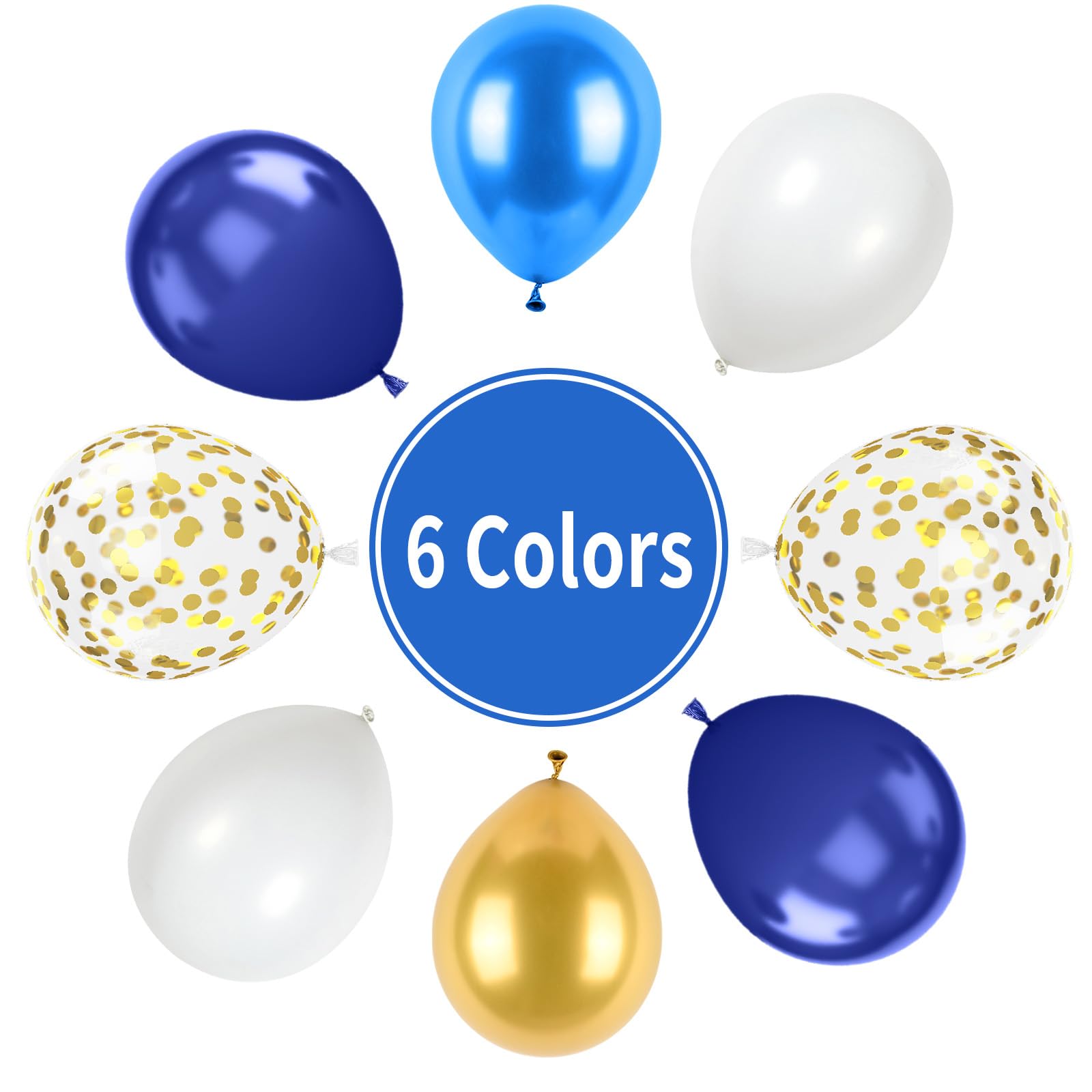 【12Inch Party Balloons Set】: The navy blue and gold balloons set includes 20pcs navy blue balloons, 14pcs white balloons, 8pcs metallic blue balloons, 8pcs metallic gold balloons, 10pcs gold confetti balloons, 1pc silver ribbon. 61pcs in total. Elevate your celebrations with our birthday party balloons!