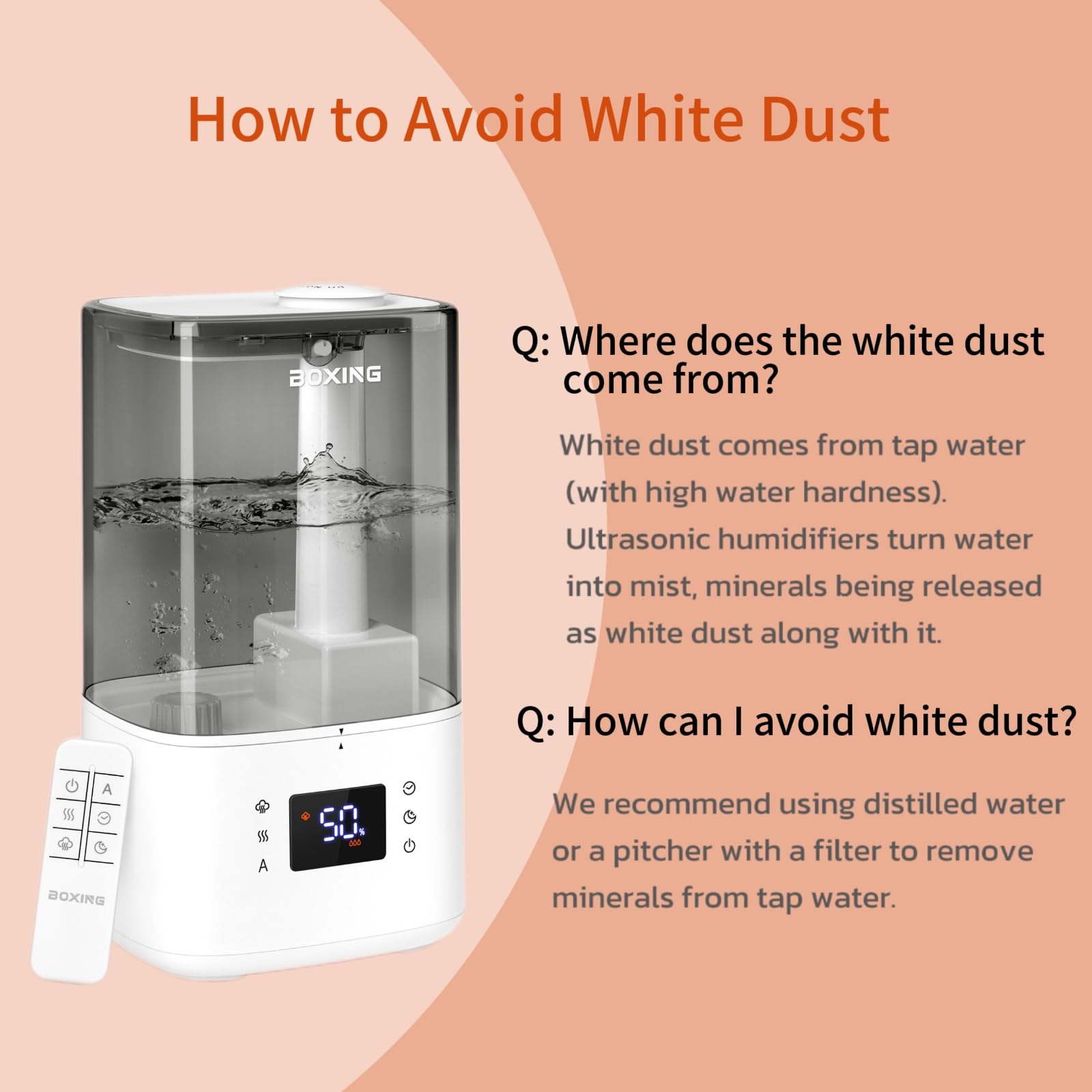 ๐‘ฏ๐’๐’˜ ๐’•๐’ ๐‘จ๐’—๐’๐’Š๐’… ๐‘พ๐’‰๐’Š๐’•๐’† ๐‘ซ๐’–๐’”๐’•: It is recommended to use distilled water or a pitcher with filter to reduce hardness from tap water in this humidifier.