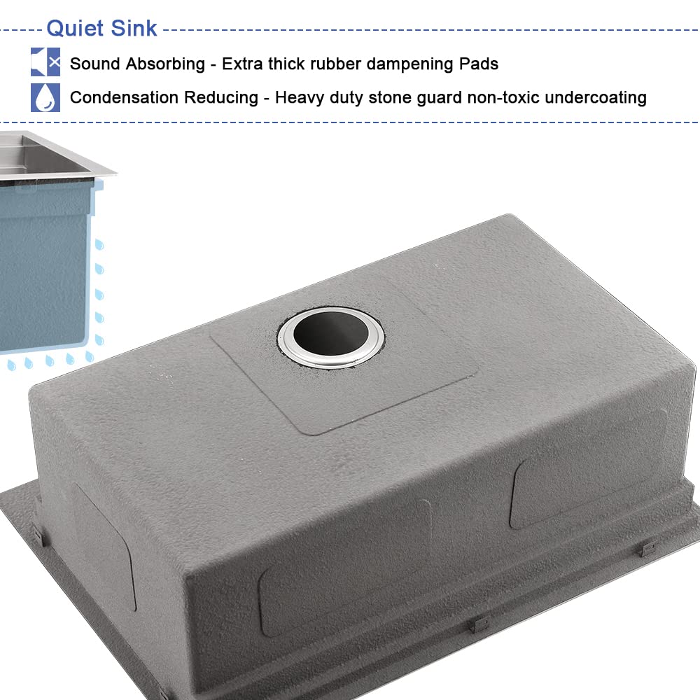 【Noise Reduction & Condensation Protection】: Thick rubber pads and heavy paint coating on the underside of this deep kitchen sink reduce noise from washing and garbage disposal. The pads also protect your cabinets from condensation when draining hot water, flushing ice, or defrosting items.