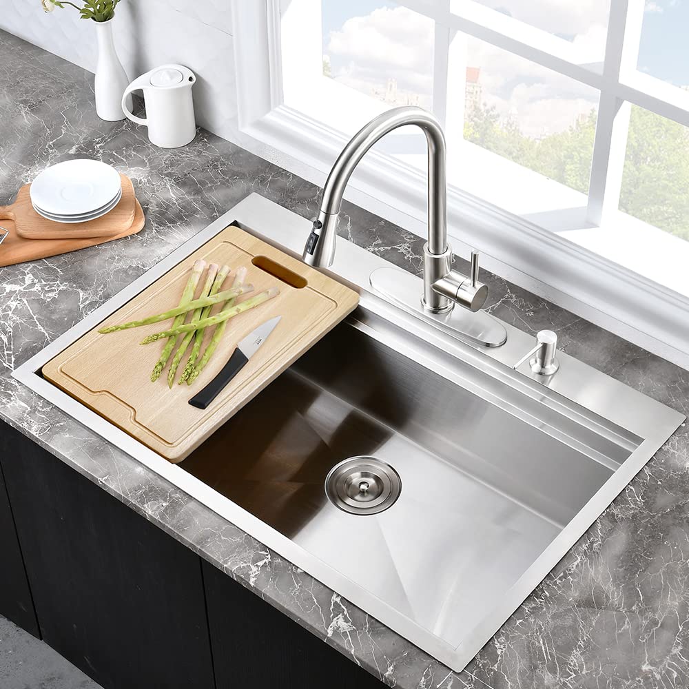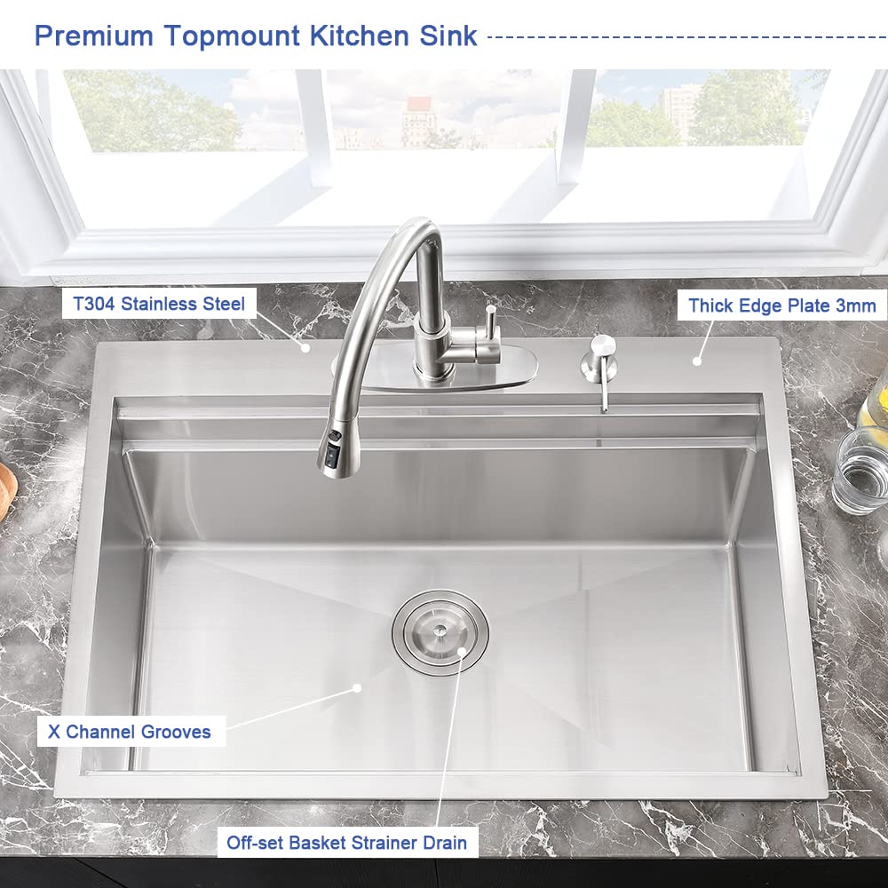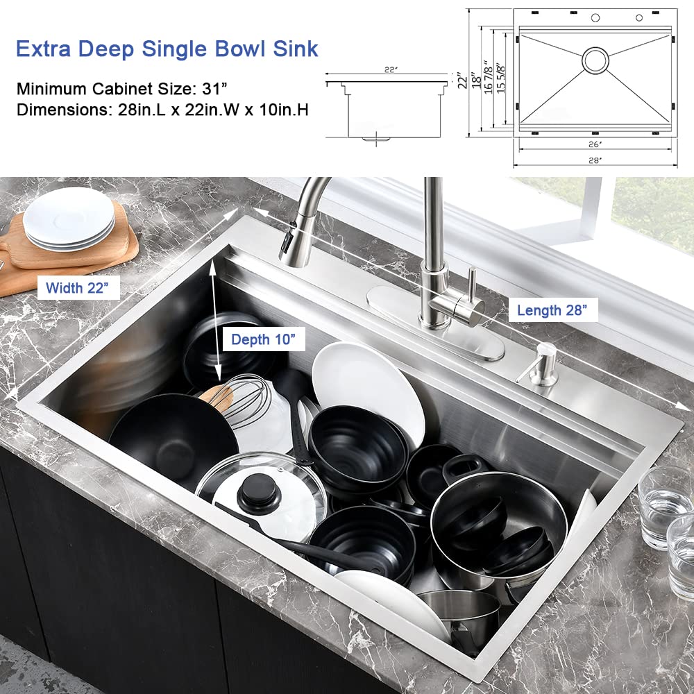 【Durable & Deep Single Bowl Design】: Crafted from solid T304 stainless steel, this 28x22 drop in kitchen sink is rust-resistant, corrosion-resistant, and built to last. The deep single bowl design accommodates stacks of dishes, pots, and pans, keeping your countertop clutter-free while hiding dirty dishes before washing.