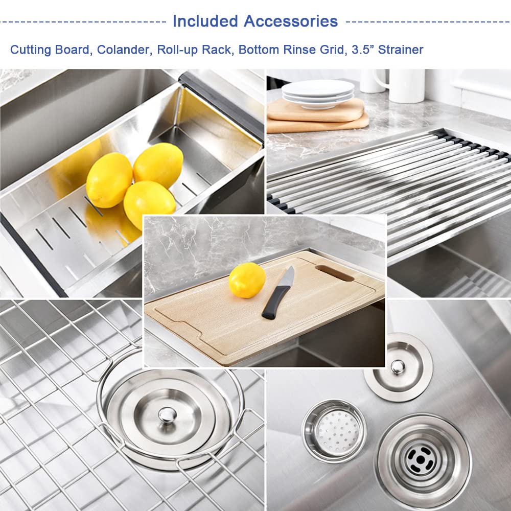 【Complete Package with Premium Accessories】: This single bowl kitchen sink comes with everything you need: a cutting board, roll-up rack, colander, stainless steel rinse grid, cutout template, installation clips, and a 3.5” standard strainer. The exterior dimensions are 28" (L) x 22" (W) x 10" (D), offering ample space for all your kitchen tasks.