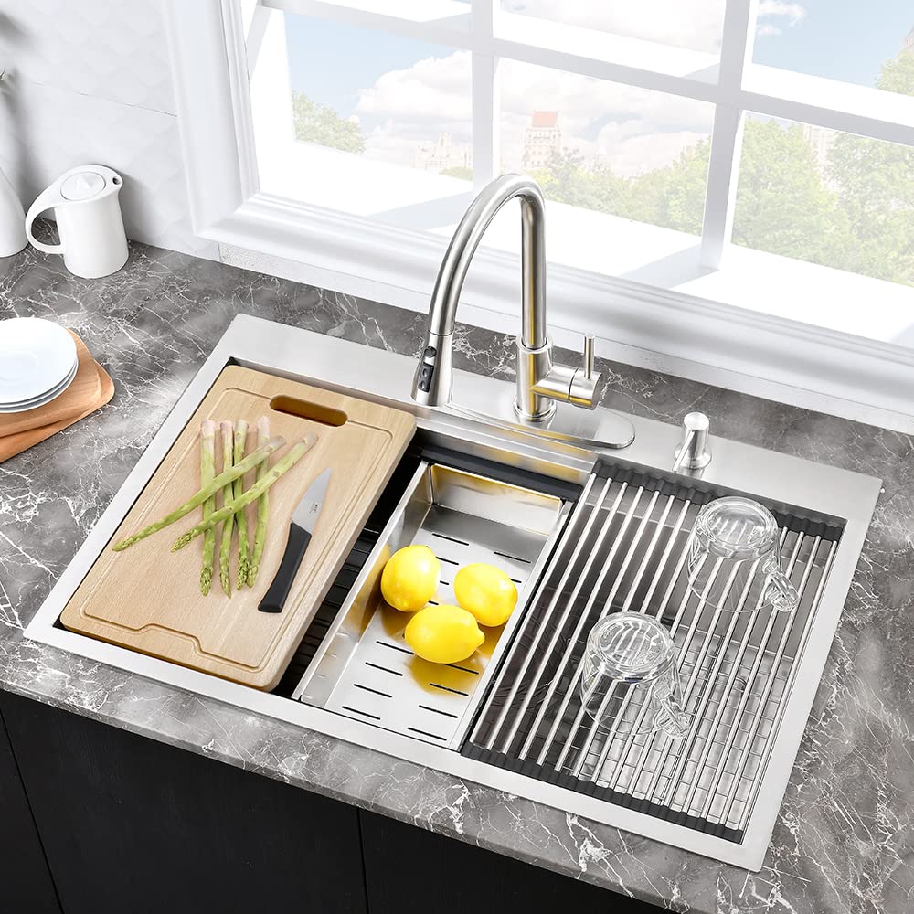 【Double Ledge Workstation Design for Maximum Efficiency】: This stainless steel kitchen sink features two-tier ledges on the front and back, providing extra space for food prep and organization. The built-in tracks allow you to slide accessories like cutting boards and colanders, transforming your drop in sink into a fully functional workstation. Perfect for busy kitchens, especially during holidays!