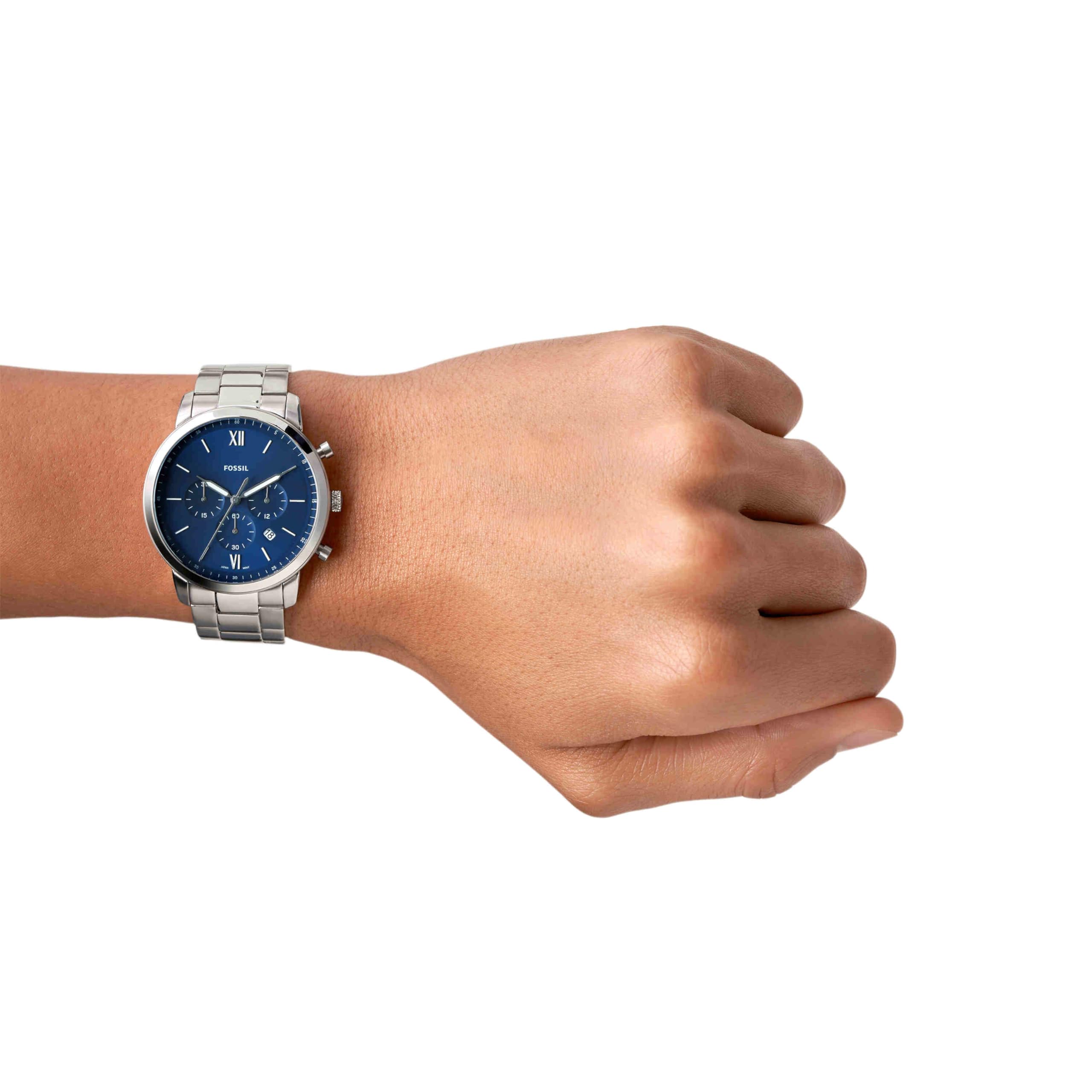 BOLD STYLE: This Neutra Fossil watch for men features a blue sunray dial and a chronograph movement; inspired by mid-century architecture, Neutra offers refined, yet versatile profile that's made to be dressed up or down