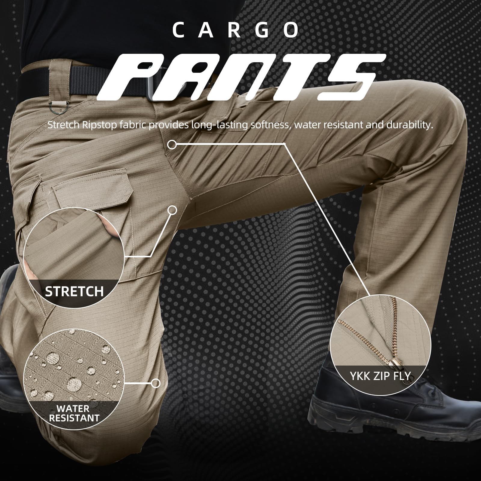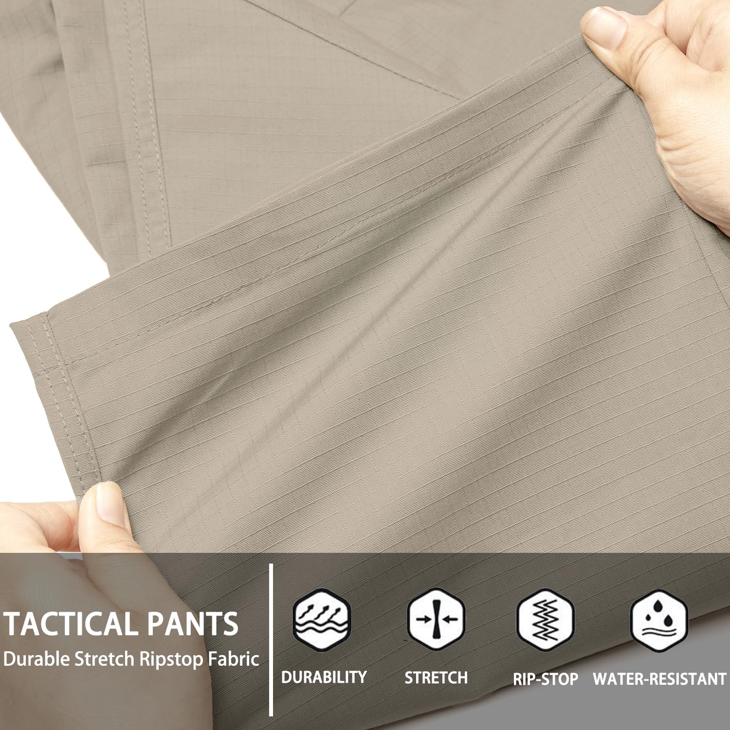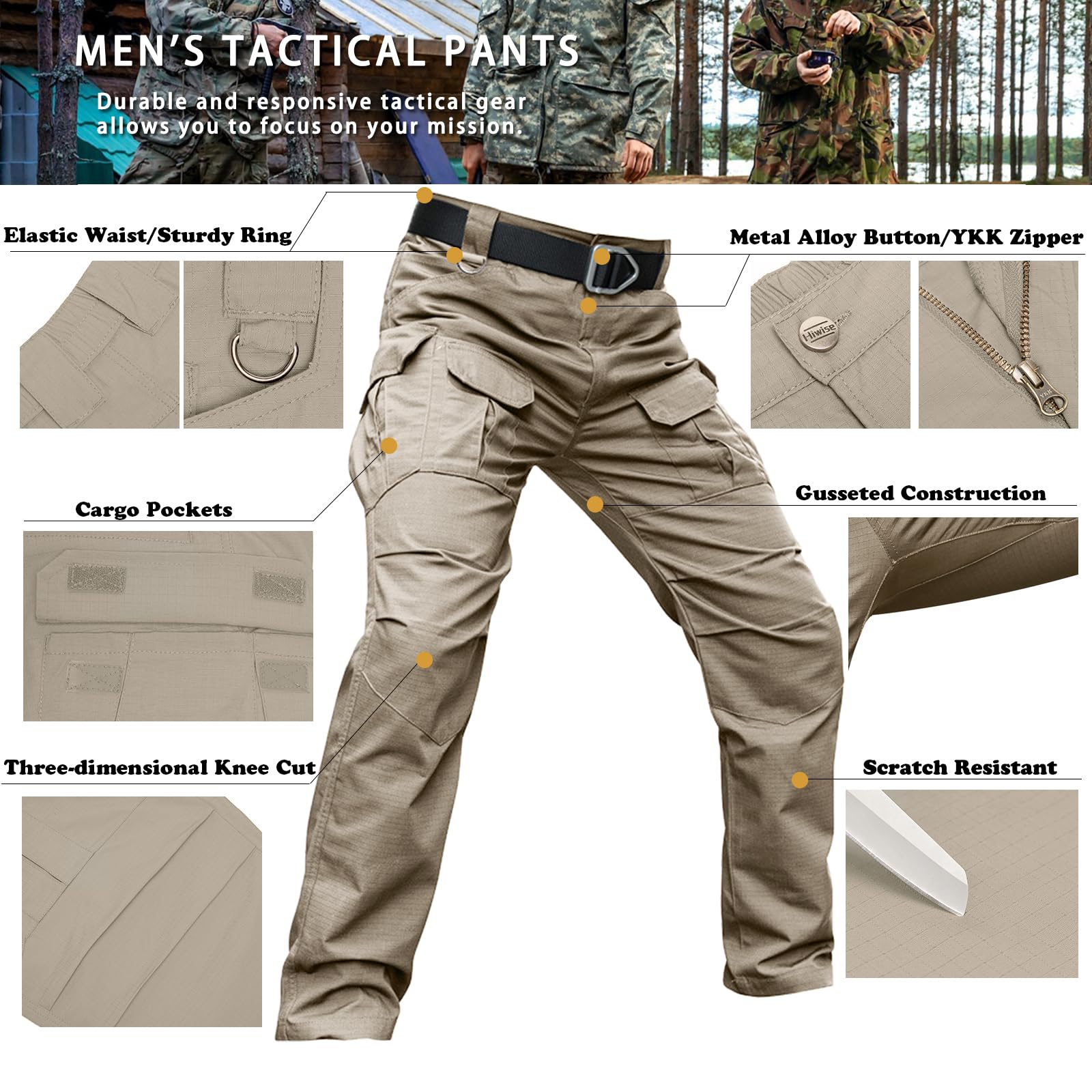 [Tactical Multi-pockets] : Total 10 Multi-purpose cargo pockets for various tools and equipment. Two front slant pockets with two small internal pockets; Two large rear pockets are fitted on both sides of the hip circumference; Two large flap pockets provide ample storage to carrying all your essential equipment; Two small flap pockets for phone and wallet. These men's hiking pants have an extremely deep tailored fit that is not only functional but also stylish.