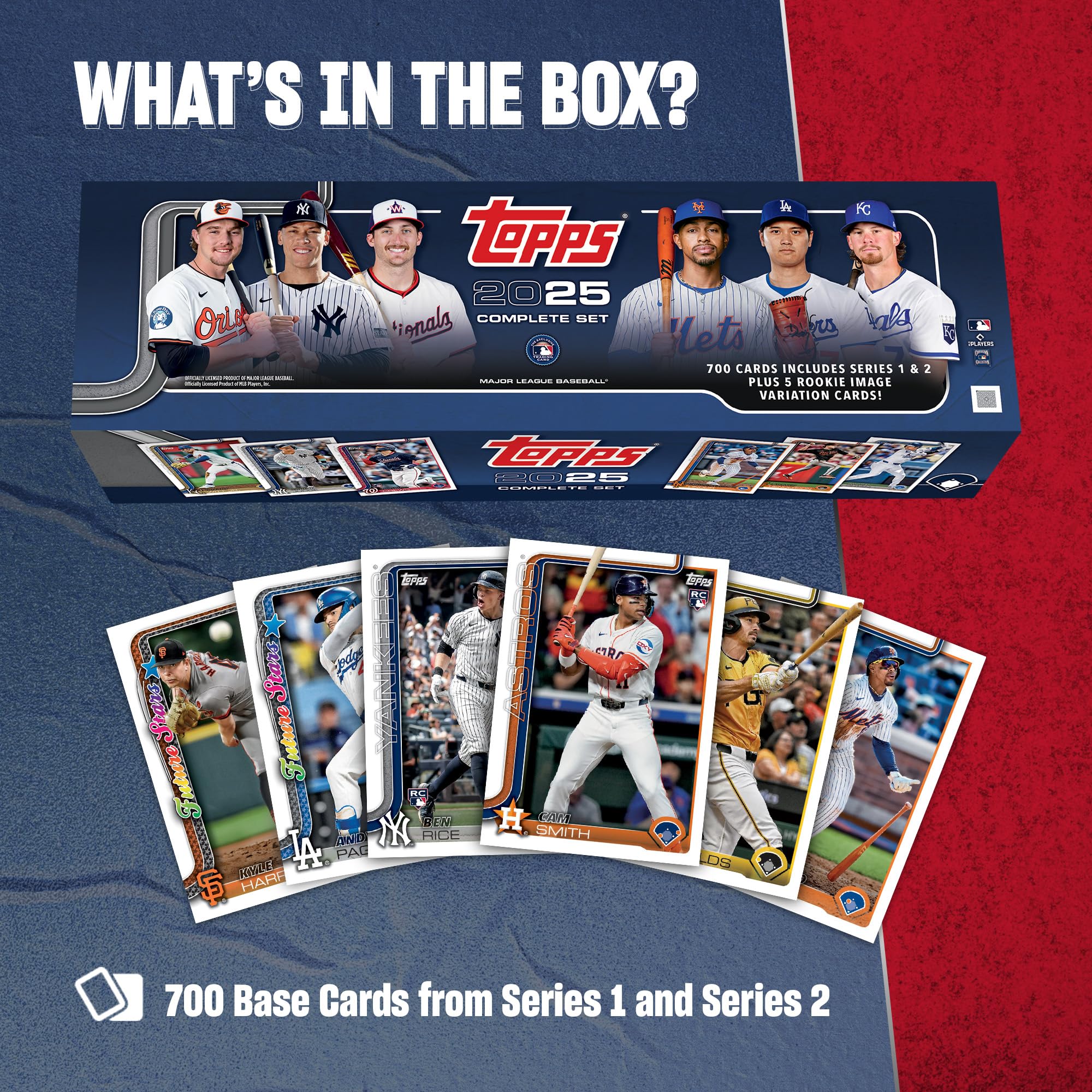The 2025 Topps Baseball Complete Set is the definitive release for fans, collectors, and anyone passionate about baseball cards. It includes all 700 base cards from the flagship checklist of Topps baseball cards across Topps Baseball Series 1 and Topps Baseball Series 2. This factory sealed box set is the most complete way to experience the 2025 season—delivering rookies, teams, league leaders, MLB stars, and more in one collectible format. It’s the perfect gift for the sports fan or baseball card collector in your life, offering a complete season’s worth of cards in one iconic set. Inside this baseball card box, collectors will find a complete run of sports trading cards, including standout rookies like James Wood, Jacob Wilson, and Roki Sasaki, plus hobby headliners Shohei Ohtani, Mike Trout, Aaron Judge, and Ronald Acuña Jr.. This release also marks the only place to find short print rookie cards #698–700 of Cam Smith, Kristian Campbell, and Matt Shaw, plus a retail-exclusive rookie insert pack with image variations of the season’s top new stars. Whether you're building your baseball card set, completing your collection of 2025 Topps baseball cards, or adding to your baseball card collector archive, the Complete Set supports all collecting styles. No autographs, no inserts, no parallels—just the full base experience for every baseball trading card fan. Collectors of Topps chrome, bowman baseball cards, and other sports cards will appreciate the value and accessibility this complete set brings. It’s a celebration of Topps MLB heritage— for collectors who want the full season, the full story, and the full checklist in one box.