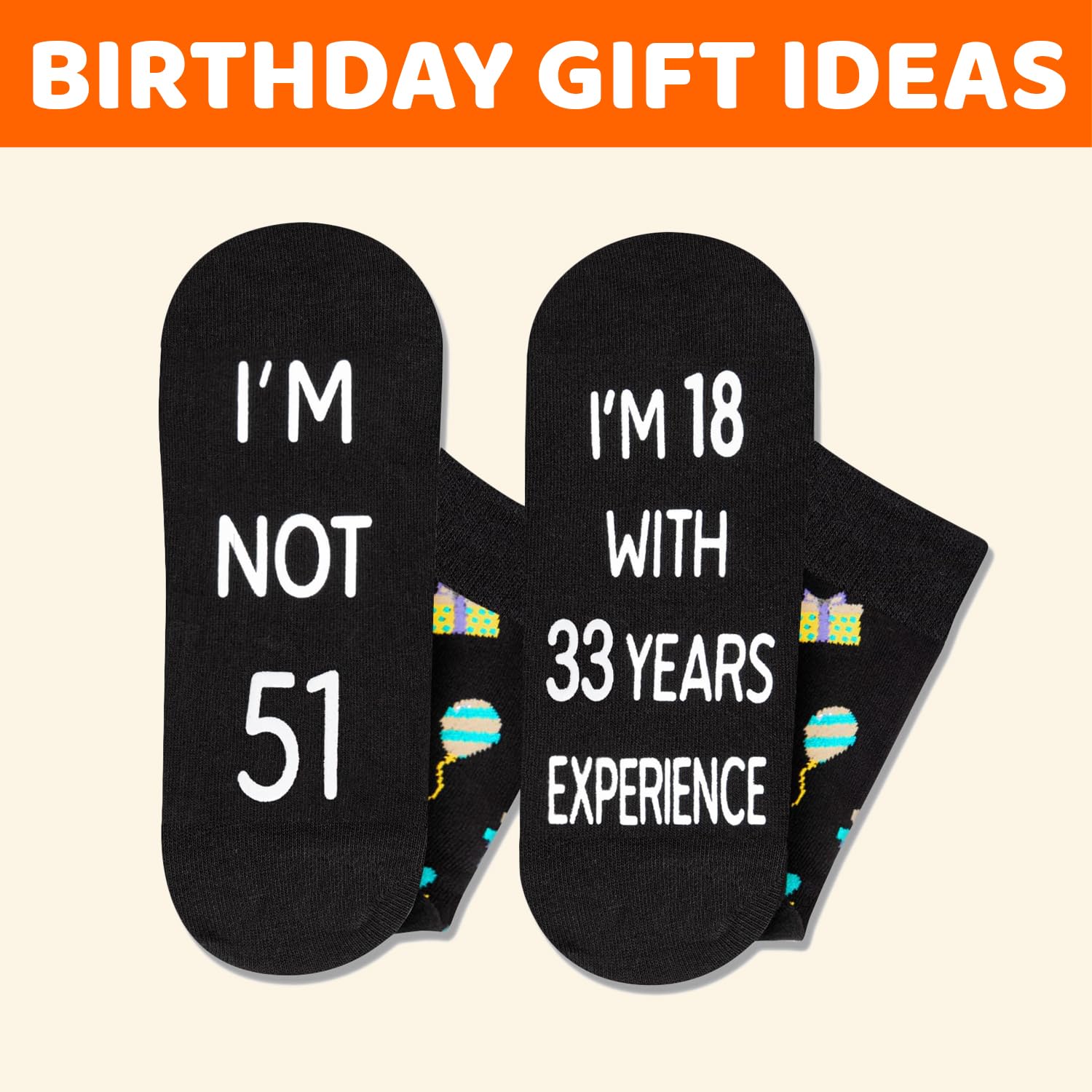 51 BIRTHDAY GIFT IDEAS: "I'M NOT 51, I'M 18 WITH 33 YEARS EXPERIENCE." These birthday socks feature a funny saying that reads These are suitable for any holiday gifts, like Birthday gifts, Christmas gifts, or White Elephant gifts.
