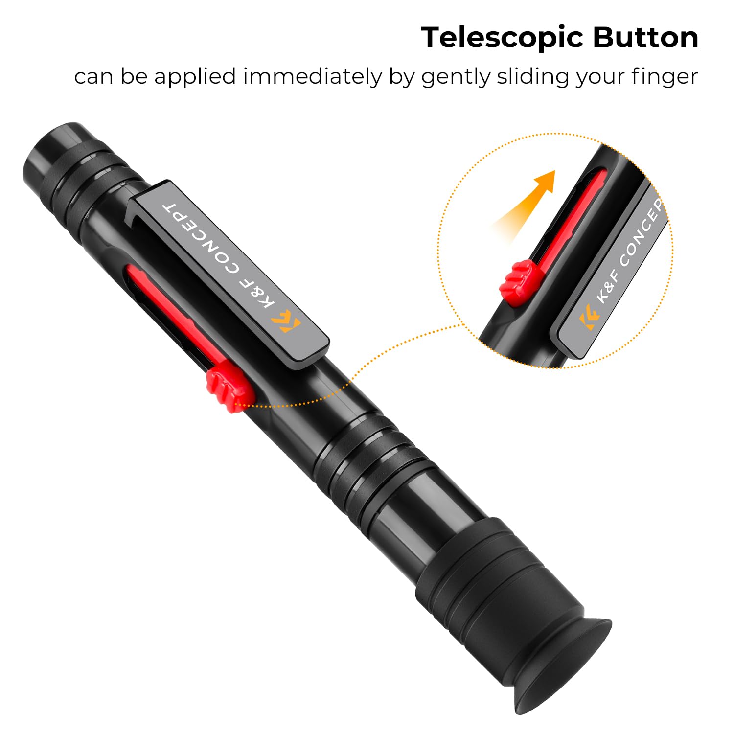 【Soft Brush Head】 The soft brush is excellent for cleaning in hard to reach areas, such as in gaps around the lens and rims of filters. And the lens cleaner pen has a telescopic button that can be applied immediately by gently sliding your finger.