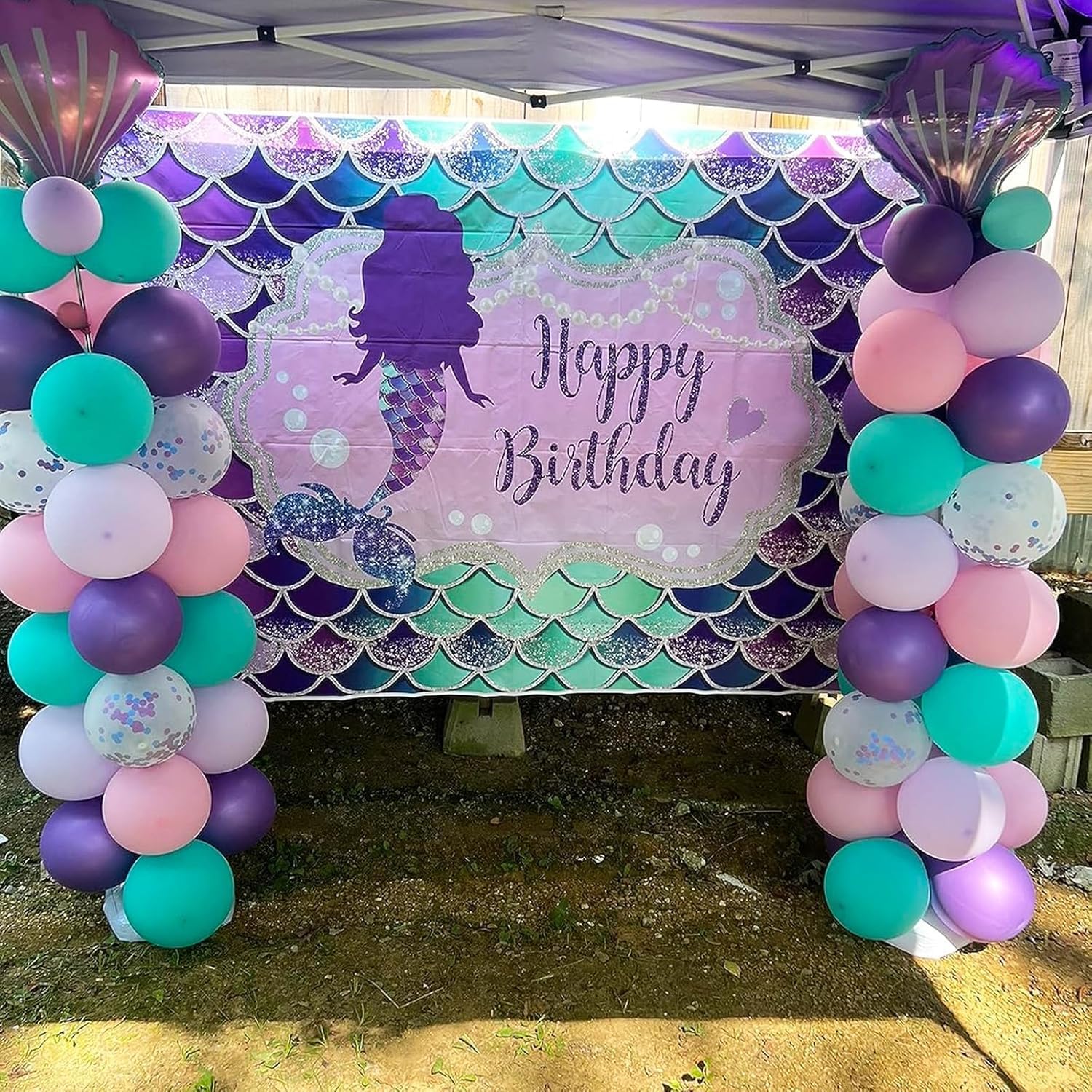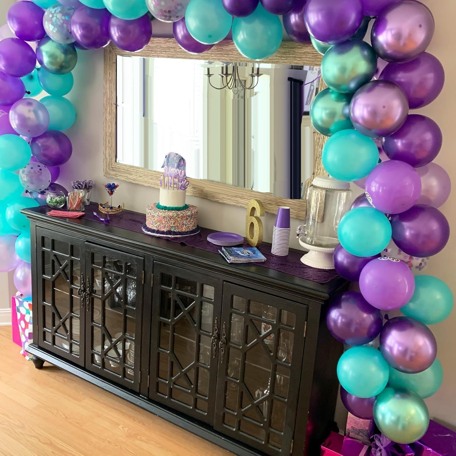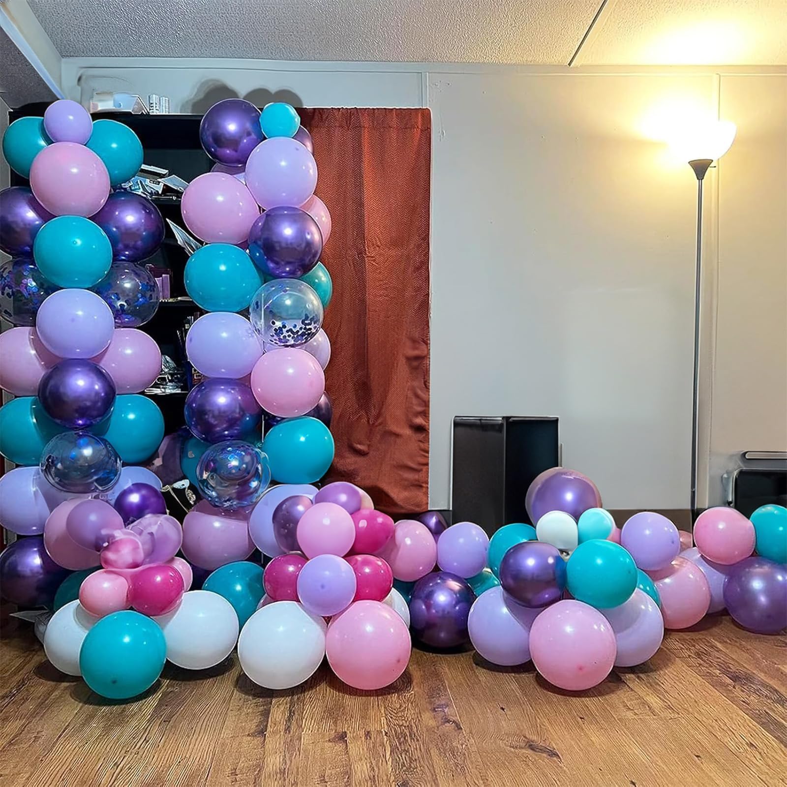 Mermaid Balloons Set: 35Pcs 12 Inch latex party decoration balloons, include 5pcs white balloons, 5pcs teal blue balloons, 5pcs purple balloons, 5pcs metallic purple balloons, 5pcs metallic dark green, 5pcs light purple balloons, 5pcs purple teal blue white confetti balloons and 1pc purple ribbon.