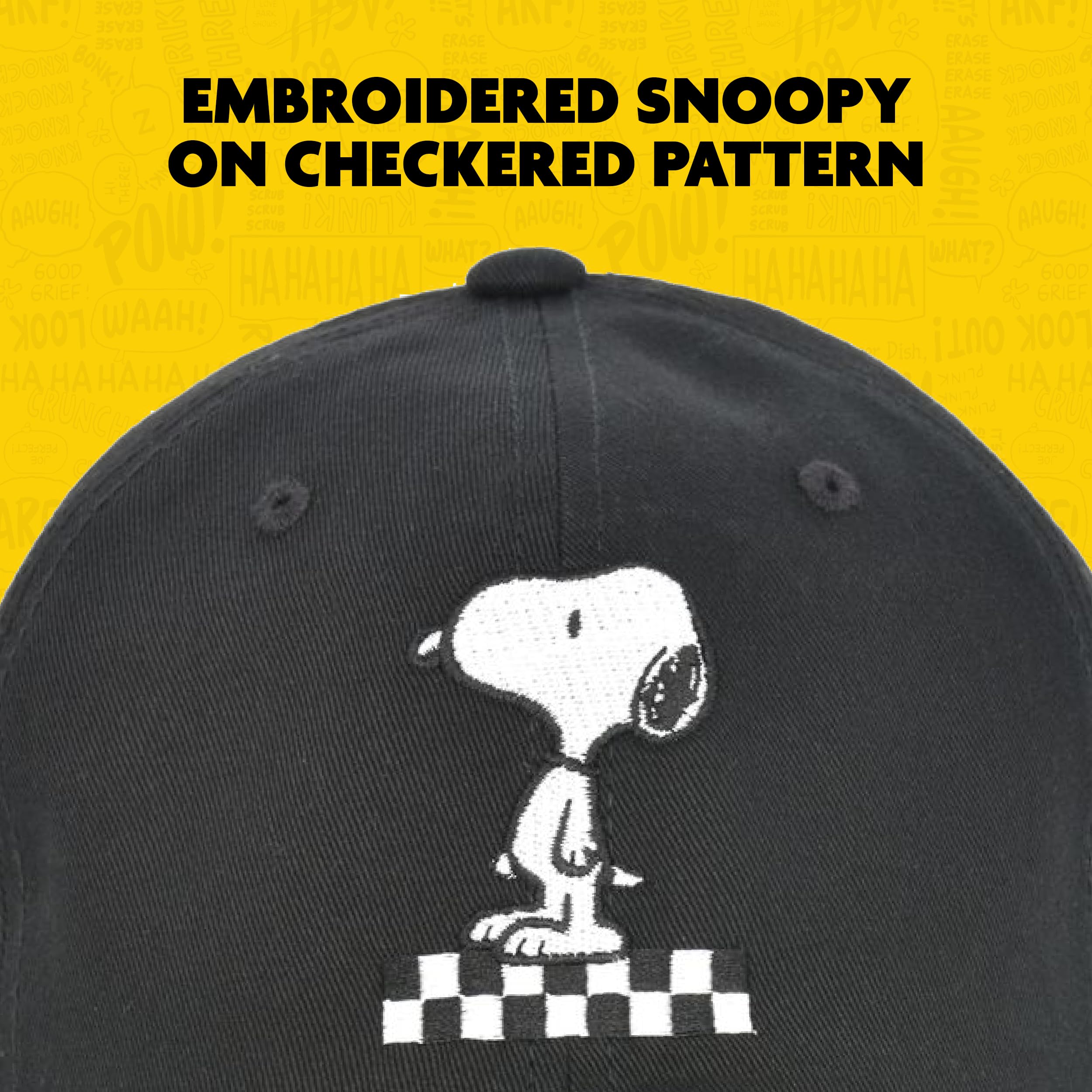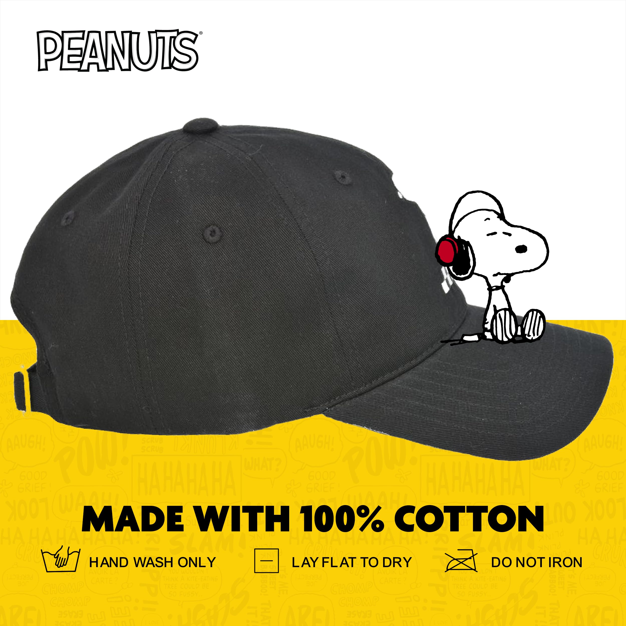 Description Add a touch of Peanuts charm to your wardrobe with this officially licensed Snoopy baseball cap — a lightweight cotton twill hat built for all-day comfort. The front features a bold embroidered Snoopy in his iconic pose, while the curved stitched brim keeps sunlight out of your eyes and the adjustable metal slider on the back ensures a comfortable fit on heads of all shapes and sizes. Perfect as a gift for any Peanuts fan, an everyday Snoopy cap for men, women, and kids, or a great dad hat and women's hat that pairs effortlessly with any casual look. Hand wash cold, lay flat to dry.