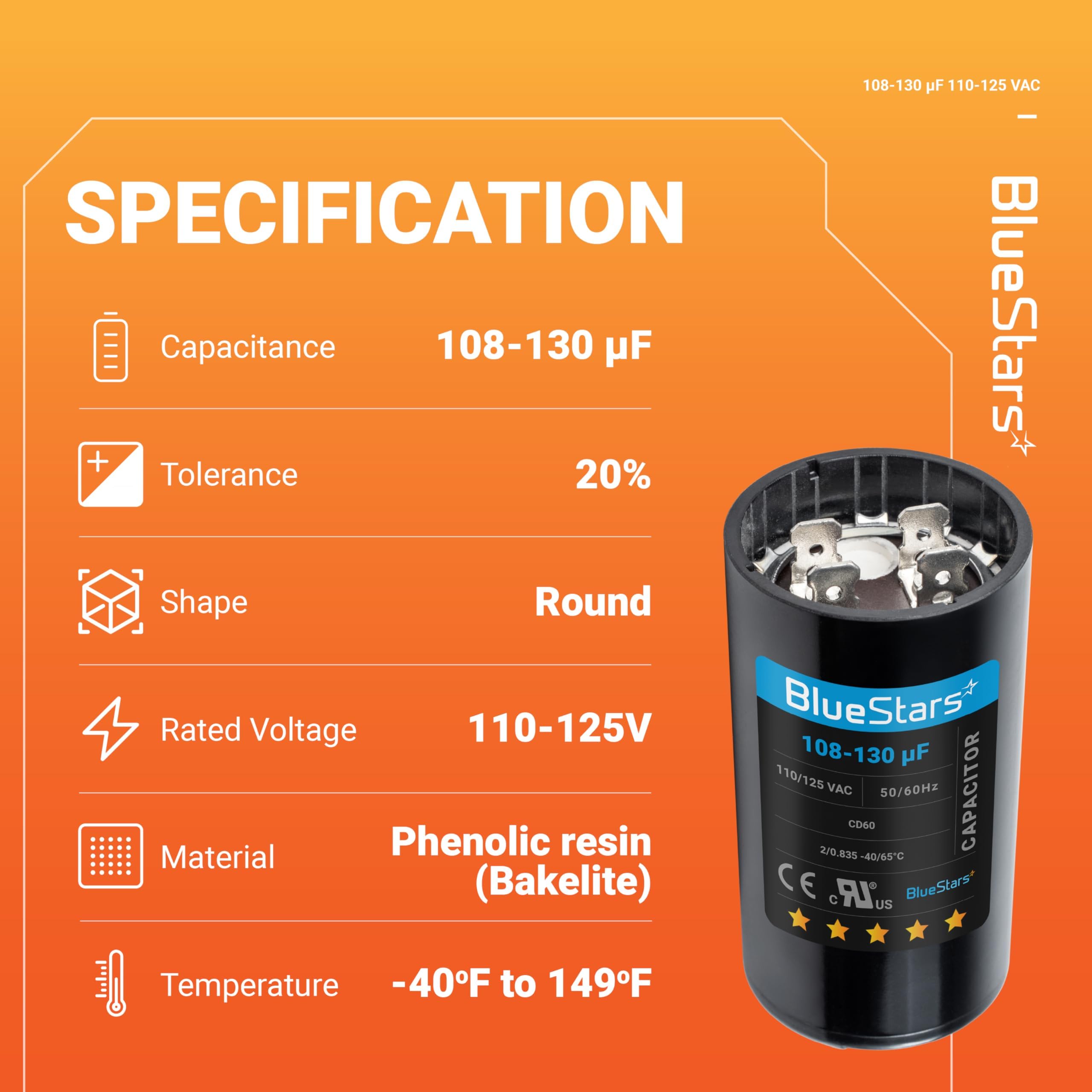 SPECIFICATIONS - Capacitance: 108-130 uf; Rated voltage: AC 110-125V; Tolerance: +/-20%; Shape: Round Motor Start; Capacitor dimensions: 1.45 in x 2.8 in / 36mm x 70mm; Operating temperature range: -40℃ to +65℃/ -40℉ to 149℉; No PCBs. Engineered for safety 10000 AFC anti explosion pressure switch