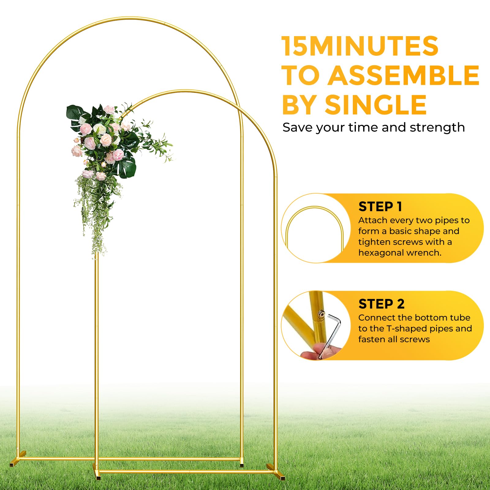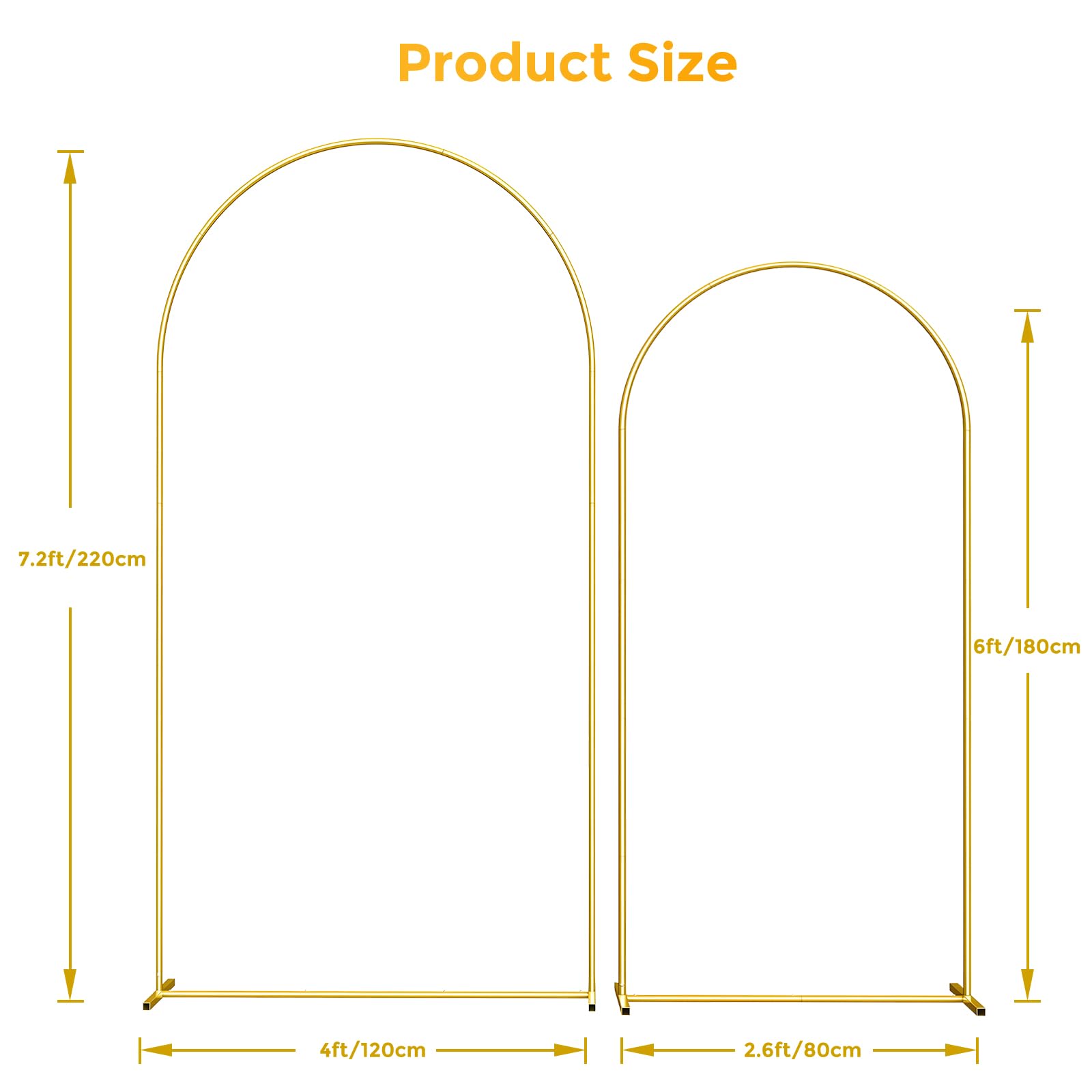 【Unique Gold Metal Arch Backdrop Stand】The wedding arch backdrop stand set of 2, Consists of a 7.2x 4 feet and a 6 x 2.6 feet backdrop arch stand. The metal wedding arch is made of high quality rustproof metal material, which can be reused many times. The design is simple and elegant, suitable for any wedding occasion. The gold wedding arch is in the shape of an elegant door, suitable for both indoor and outdoor use, just add some decorations to impress your guests.