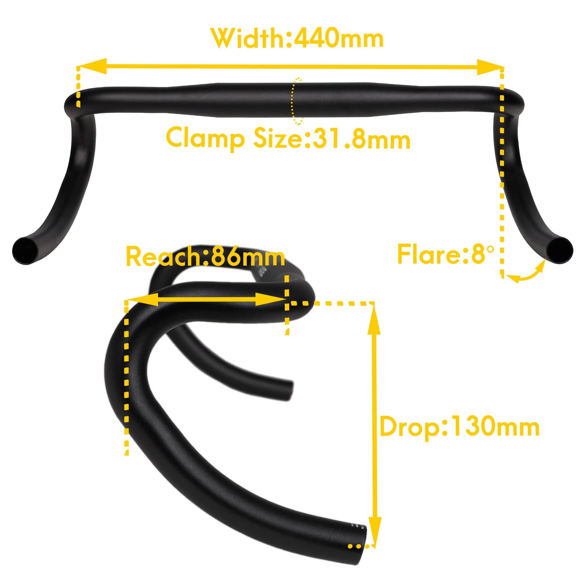 SPECS: Clamp Size: 31.8mm. Width: 420/440mm. Drop: 130mm. Reach: 86mm. Flare: 8 degrees.