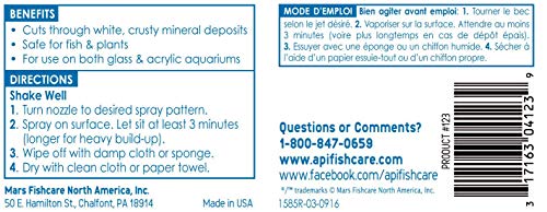 API SAFE & EASY cleans both the inside and outside of glass or acrylic aquariums and cuts through white, crusty mineral deposits. Safe for both plants and fish, and comes with easy-to-use spray nozzle. Contains 8 fl oz of API SAFE & EASY. Use according to directions on product label. With API Aquarium products, it’s easy to keep a beautiful saltwater, freshwater or reef aquarium. For over 50 years, API has been creating innovative, research-driven solutions that make it easier to care for your fish and aquarium. API Aquarium Treatment Supplies are designed to work in conjunction with each other to provide best results to control algae, promote healthy bacterial growth and help control and cure fish diseases and conditions such as ich and fin rot. They work to provide a safe, hospitable environment for fish such as tropical community fish, cichlids, goldfish and more. With API, you can spend more time admiring your fish, and less time scrubbing your tank. Make sure to use all products as directed in order to ensure the best results. Directions For Use On All Surfaces: Shake well before using. Turn nozzle to "spray" or stream position. Spray on any surface of the aquarium, allowing solution to remain for three minutes. To loosen heavy build-up, let solution set longer. Wipe treated surface with a damp sponge or cloth. Dry cleaned surface with a clean cloth or paper towel. Note: When cleaning the inside of empty aquariums, use as directed and rinse aquarium thoroughly before using.