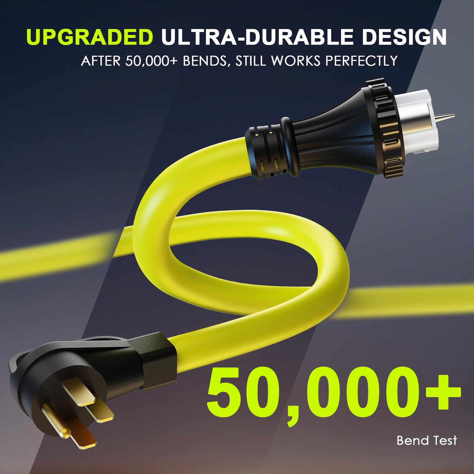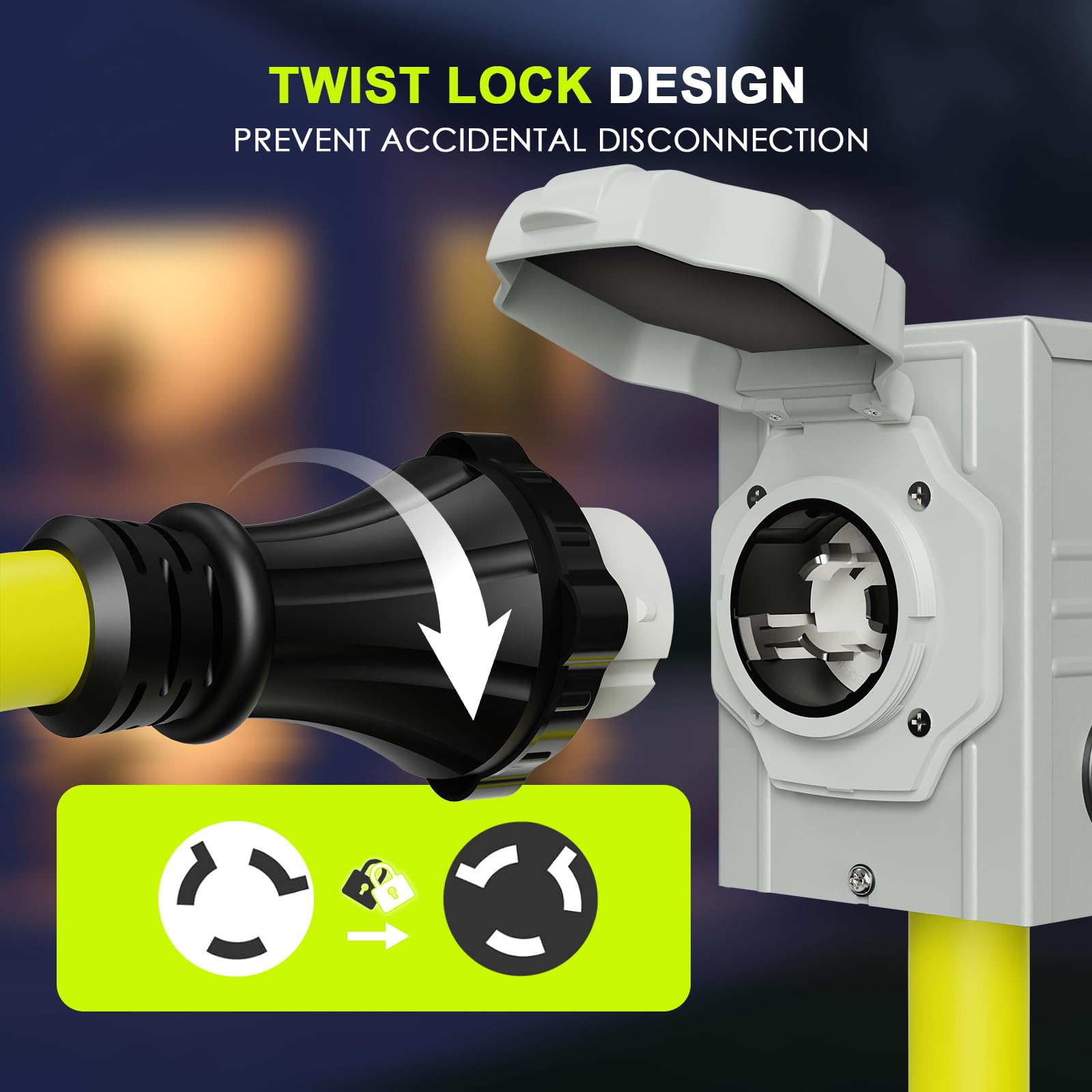 User-Centric Design: 50 amp generator cord features ergonomic grip handles, ensuring both safety and ease of use for quick and effortless disconnection. Its vibrant green color makes it easily visible in dimly lit areas, simplifying equipment handling. 50 amp generator inlet box is equipped with a secure green indicator on the flip cover, ensuring optimal performance and enhanced safety