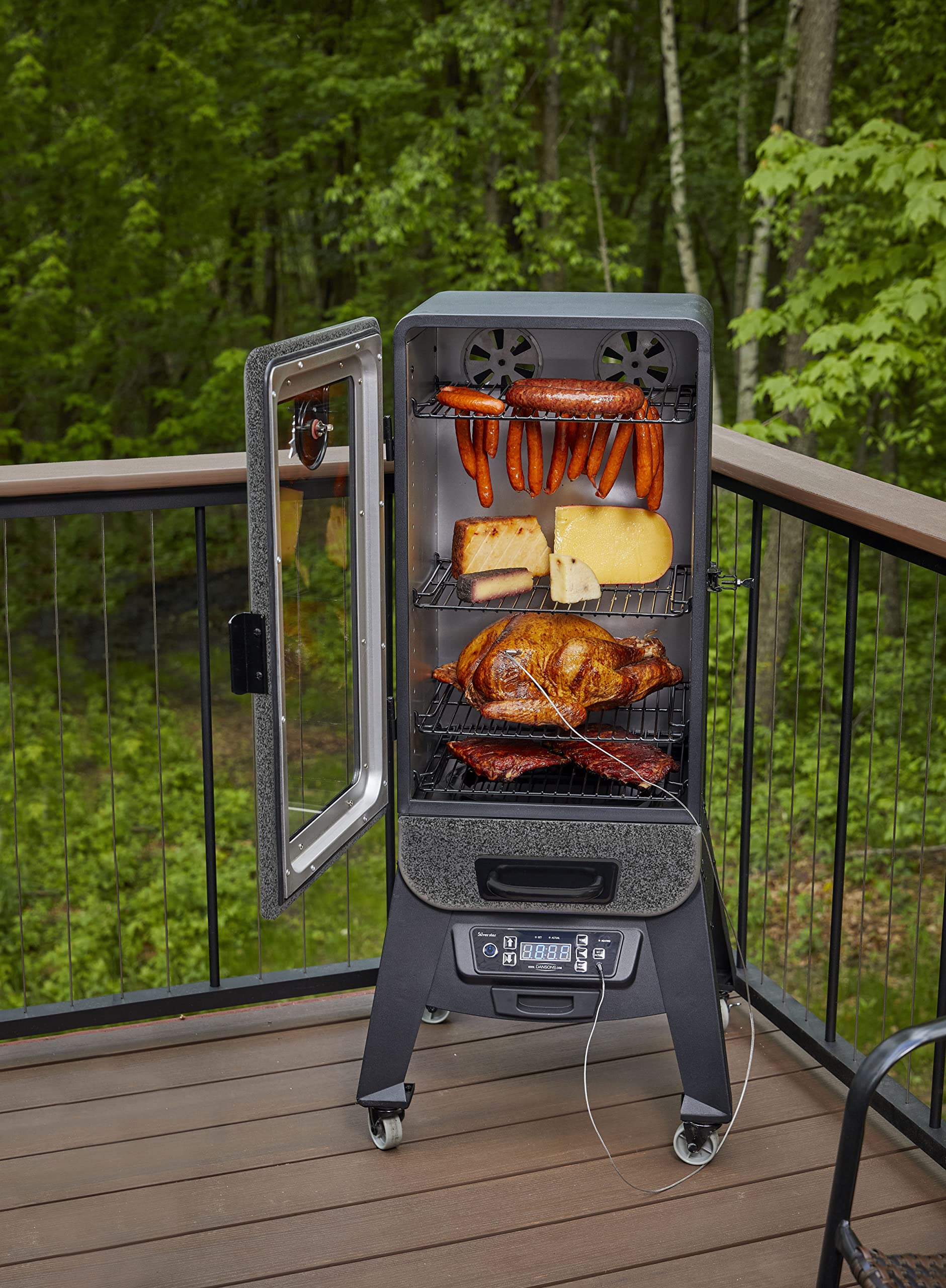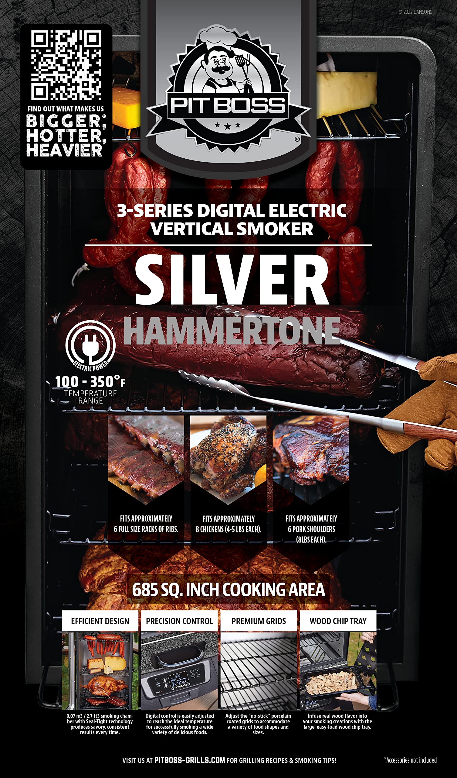 There’s a new boss in town – introducing the Pit Boss® 3-Series Digital Electric Smoker. Gone are the days when your smoker was just another black box. The 1650-watt Smoker features a large front window that eliminates the need for peek-a-boo cooking, 684 square inches of porcelain coated cooking racks, locking caster wheels, an easy to read digital controller, a meat probe, and a stunning silver finish. Its innovative design improves upon the features of a classic smoker by incorporating an elevated stand for easy loading and unloading, a multiple position racking system that ensures you’ll have enough room to smoke anything your heart (or stomach) desires. The ability to infuse flavor into your smoker is easy with the oversized front load wood chip tray, offering up to 2 hours of cooking time per load. The superior ground up engineered design gives you the ability to reach higher highs and lower lows. The double walled blanket insulation lets you smoke from 100°F to temperatures reaching 350°F, unlike any other smoker on the market, and allows you to get the crispy skin on poultry or that great bark on beef and pork.