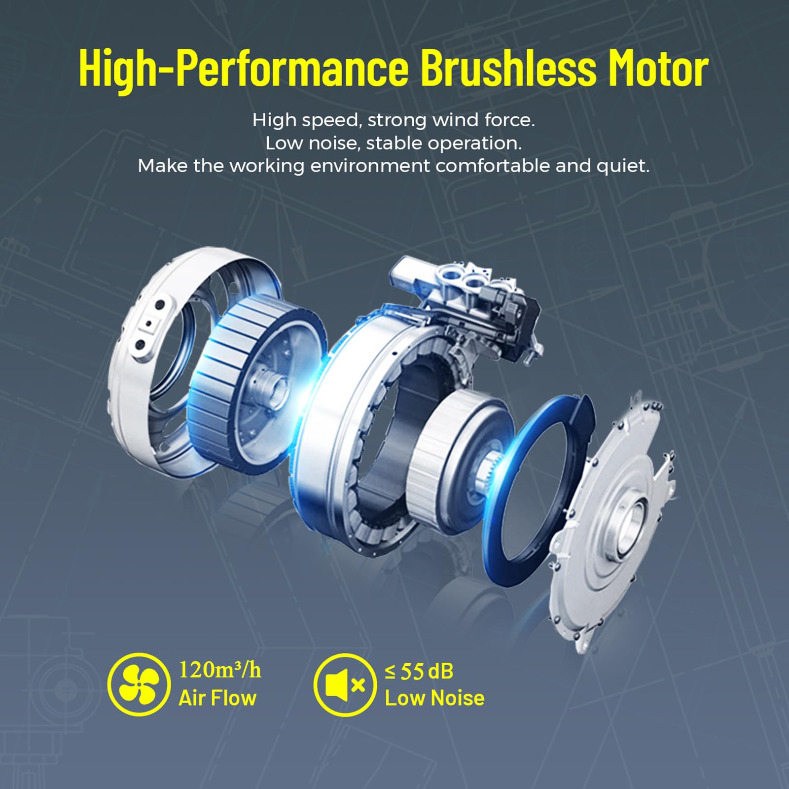 [𝟗𝟗.𝟗𝟕% 𝐇𝐢𝐠𝐡-𝐞𝐟𝐟𝐢𝐜𝐢𝐞𝐧𝐜𝐲 𝐏𝐮𝐫𝐢𝐟𝐢𝐜𝐚𝐭𝐢𝐨𝐧]: 85 watt High-power brushless DC motor to provide 180m³/h air volume while keep low noise. powerful suction instantly captures fumes and particles. H13 HEPA and high iodine activated carbon filter can Efficiently captures fine PM0.3μm particles, removes harmful gases and odors in soldering, with a purification efficiency of up to 99.97%