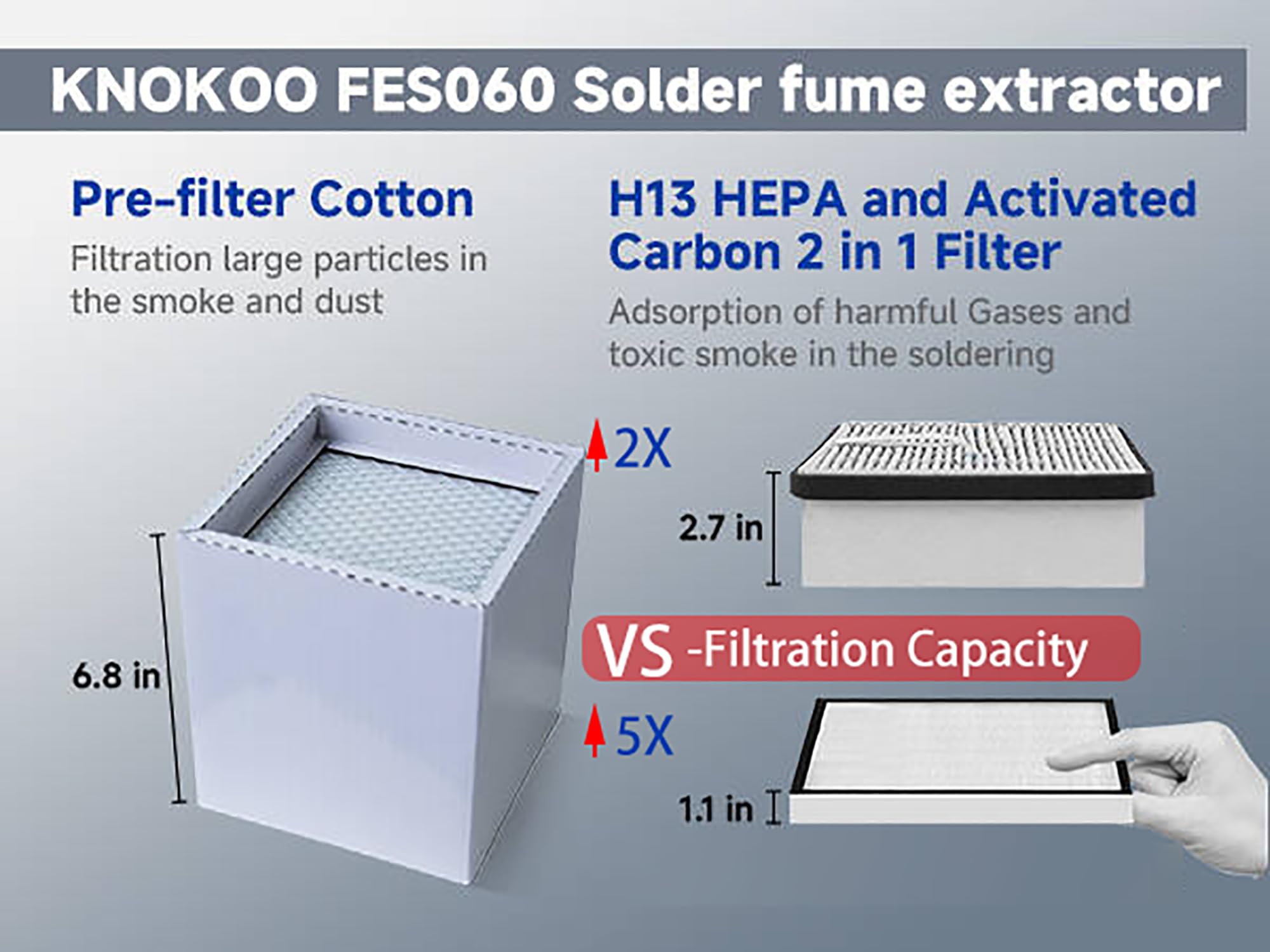 𝐌𝐮𝐥𝐭𝐢𝐩𝐥𝐞 𝐅𝐢𝐥𝐭𝐫𝐚𝐭𝐢𝐨𝐧 𝐒𝐲𝐬𝐭𝐞𝐦 (𝟑-𝐬𝐭𝐚𝐠𝐞 𝐟𝐢𝐥𝐭𝐞𝐫):- KNOKOO fume absorb continuously exhaust the soldering fume and lead mist, and rapid discharges it into the Pre-filter cotton, HEPA filter and activated carbon filter to purifier smoke and unpleasant odors. each layer can be replaced separately. Three -layer filter Structure has larger dust capacitance than single-layer filter core, longer service time of filter core and more cost-saving