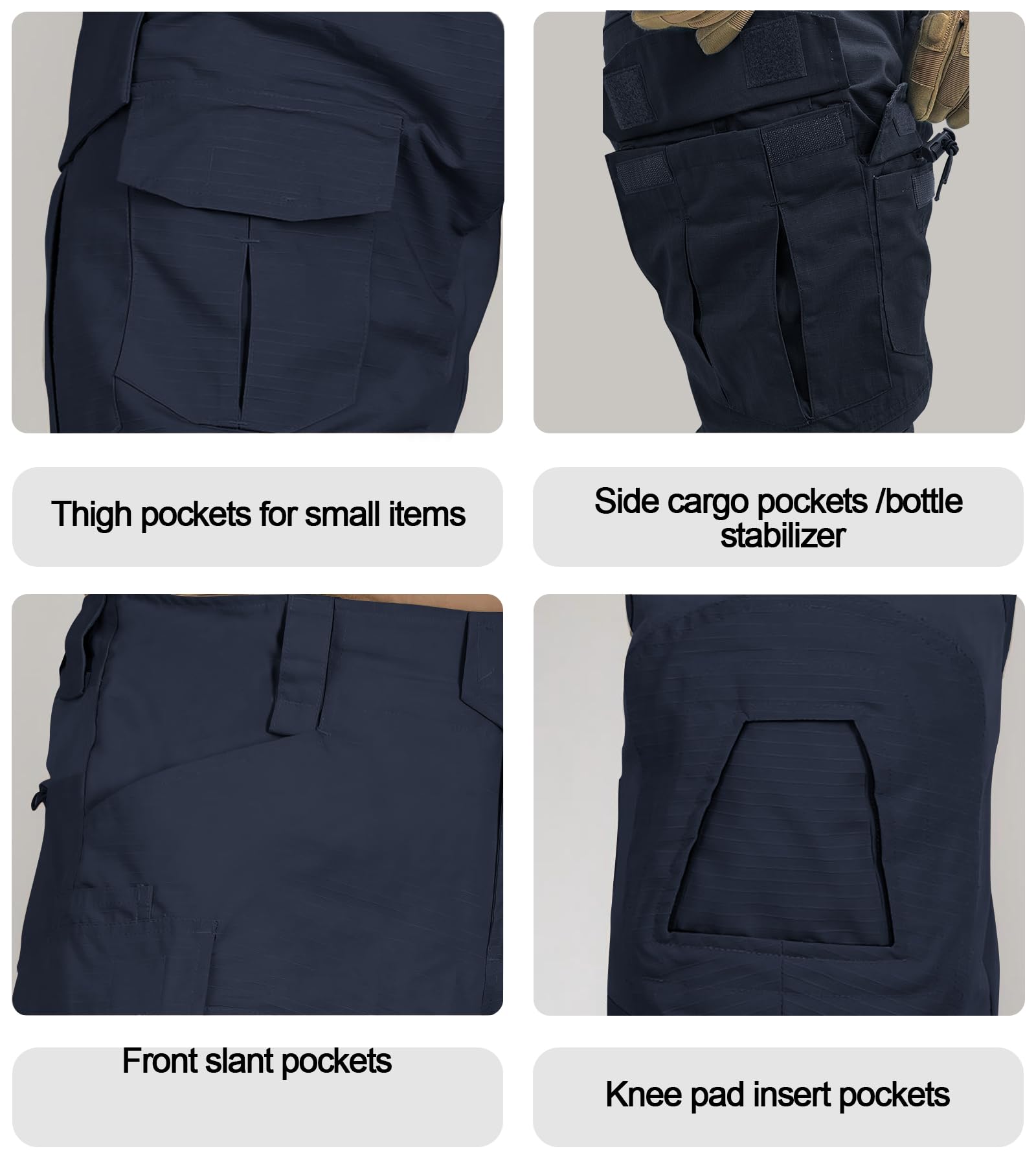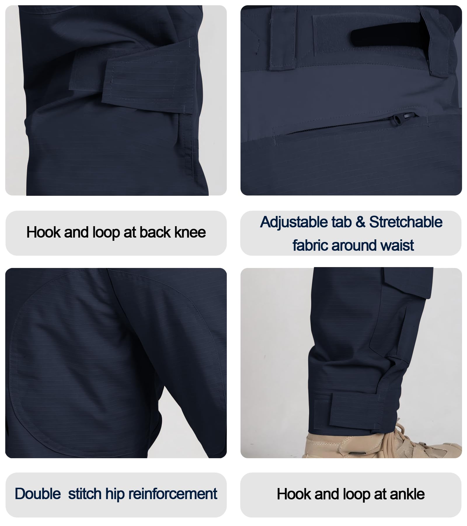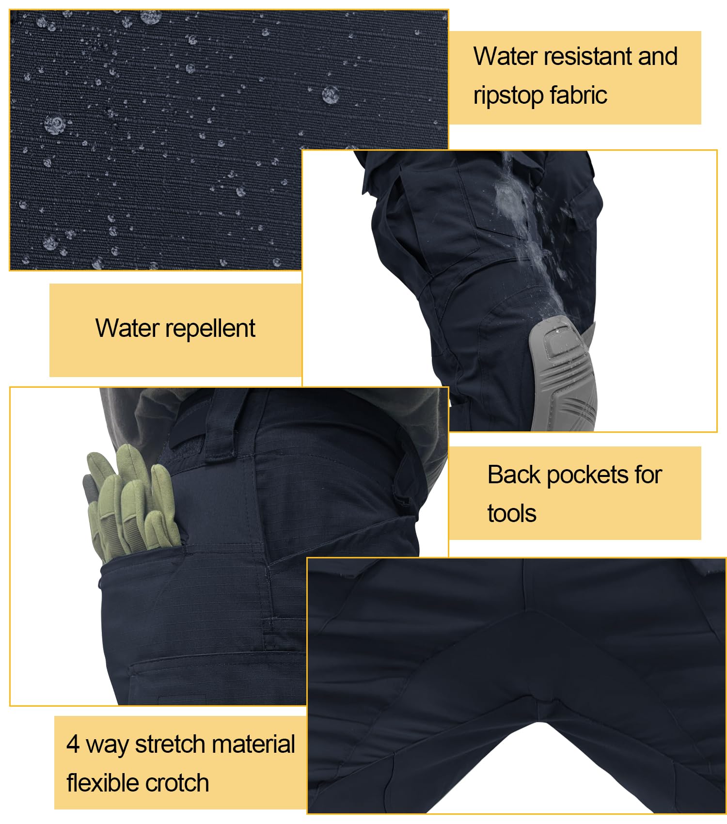 Multi pocket cargo pants for men: The camo pants men are with 10 pockets for tactical tools and self items. Including 2 front slant pockets; 2 thigh pockets; 2 side leg pockets; 2 side calf pockets; 2 zipper rear pockets.There are three hook and loop panels sewn onto the knee pad pockets top and sides which attach to the hook and loop material inside to pant legs which drastically helps prevent the knee pad blowing out