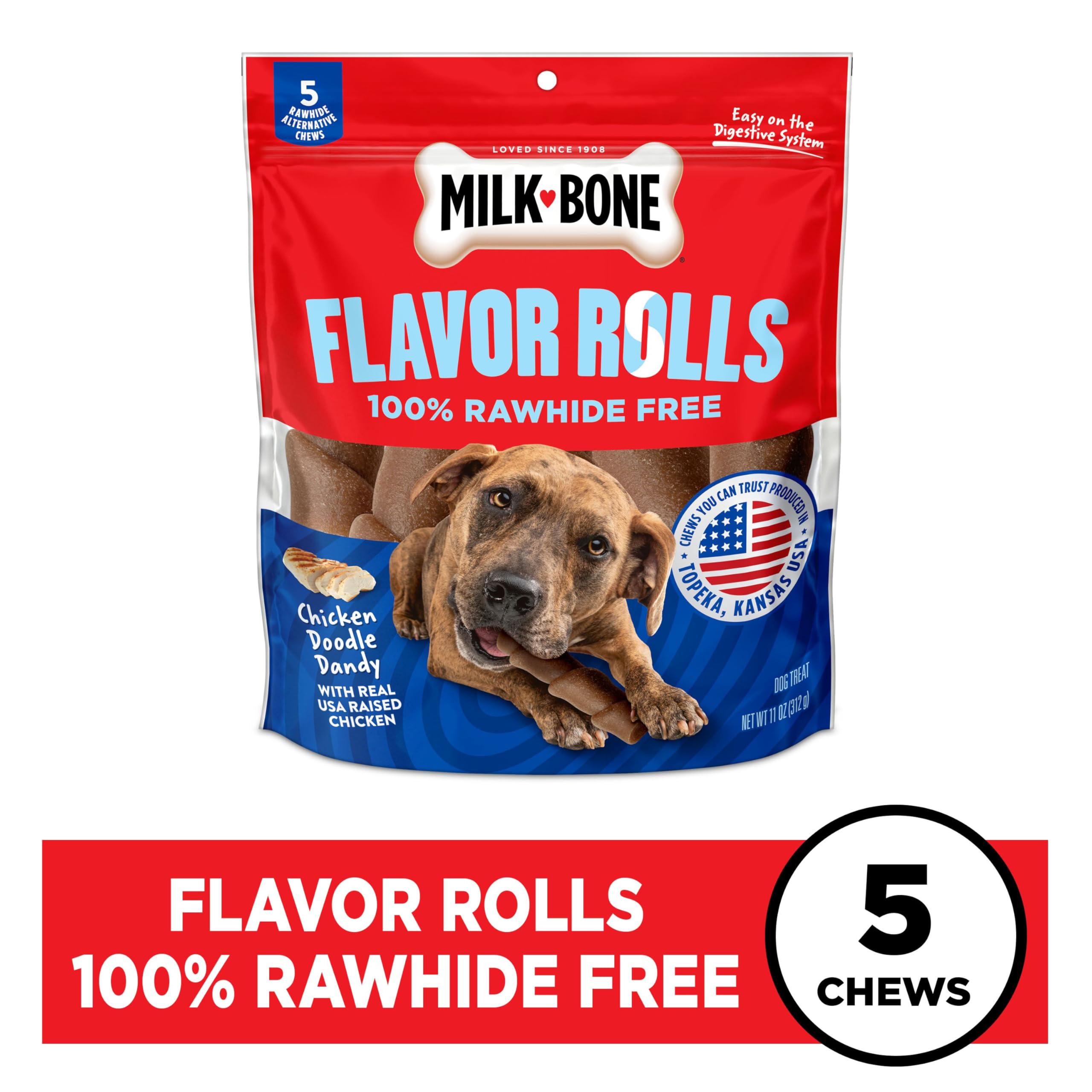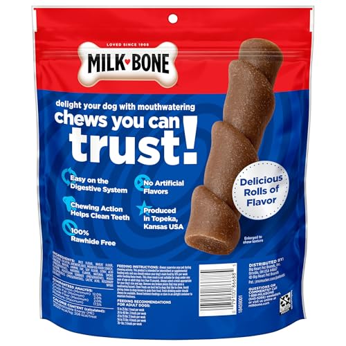 Contains one (1) bag of five (5) Milk-Bone Flavor Rolls dog chews (2.2 oz. per chew)