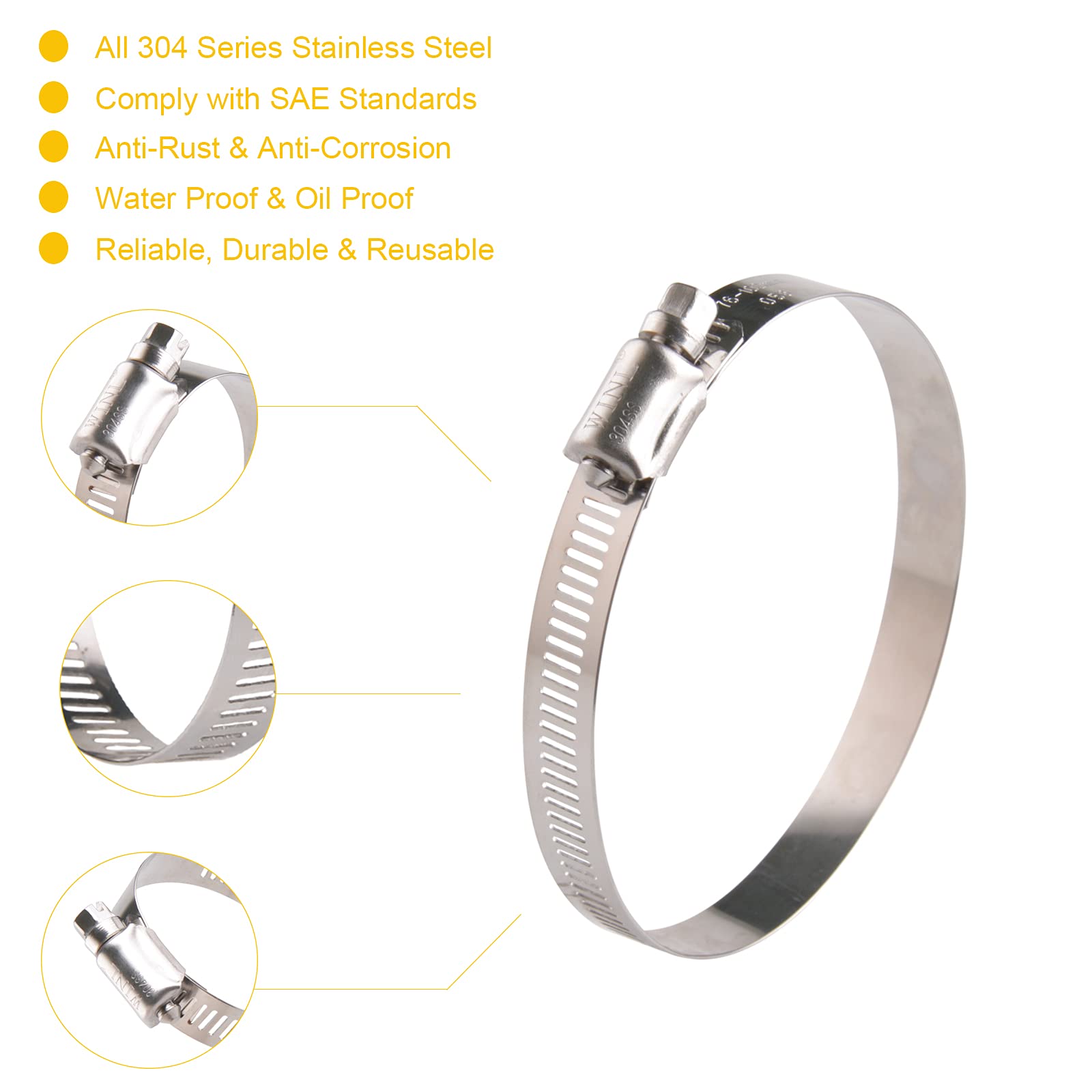 Premium Materials: WINL SAE 48 hose clamps of 64mm-89mm are all 304 stainless steel ( including band, housing and screw) to provide maximum corrosion resistance to salt and most chemicals. The worm drive hose clamps comply with SAE standards. WINL stainless steel hose clamps are salt resistant, anti-rust, anti-corrosion, water proof and oil proof; WINL hose clamps are reliable, strong, reusable and durable.
