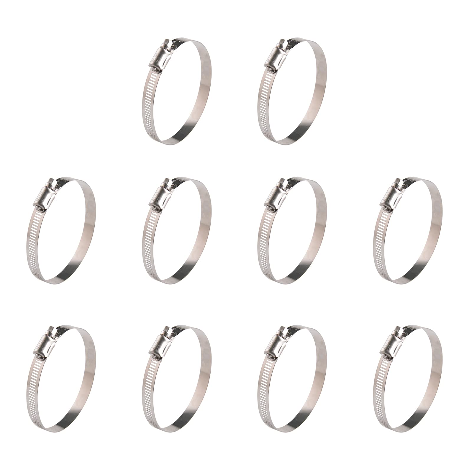 WINL All 304 Stainless Steel Hose Clamps SAE Size 48, 2 1/2'' Hose Clamps, 2 3/4'' Hose Clamps, 3'' Hose Clamps, 3 1/4’’ Hose Clamps, 3 1/2'' Hose Clamps. WINL hose clamps are 304 stainless steel housing, band and screw, conform to SAE 300 series standard to provide resistance to corrosion and prevent flow leakage. WINL worm gear drive hose clamps are flexible and durable with adjustable size range to precisely apply sealing pressure. WINL hose clamps hold the pipes tightly. The hose clamps are easy installation. WINL stainless steel hose clamps are widely suitable for automotive, industrial, electronic, gardening, home and more. Specifications: Size: SAE# 48 Hose Clamps Materials: All 304 Stainless Steel Clamping Range: 2 1/2 inch to 3 1/2 inch (64mm-89mm) Fits hose: hose or pipes within this range, great as 2 1/2 inch(2.5’’) hose clamps, 2 3/4 inch(2.75’’) hose clamps, 3 inch hose clamps, 3 1/4 inch(3.25’’) hose clamps, 3 1/2 inch(3.5’’) hose clamps etc. Band Width: 1/2 inch (12.7mm) Band thickness: 0.65mm Screw: 5/16 inch hex head Quantity: 10 Pieces Color: Silver Features: All 304 Stainless Steel Hose Clamps Rust proof and corrosion resistant Salt resistant, Water proof and Oil proof High torque, Pressure resistant Wide adjustable size range Smooth surface Durable and long time use Easy to install Installation: Step1: Loosen the screw of hose clamps with a screwdriver Step2: Thread the pipes through the hose clamps Step3: Select and adjust the hose clamps sizes to fit your hose pipes Step4: Tighten the screw and the hose clamps hold. The hose clamps come in a variety of designs and distribute uniform pressure over the circumference of hoses to bind them to fittings. The slotted, 5/16’’ hex-head screw allows the installation using a blade screwdriver, nut driver or socket wrench.
