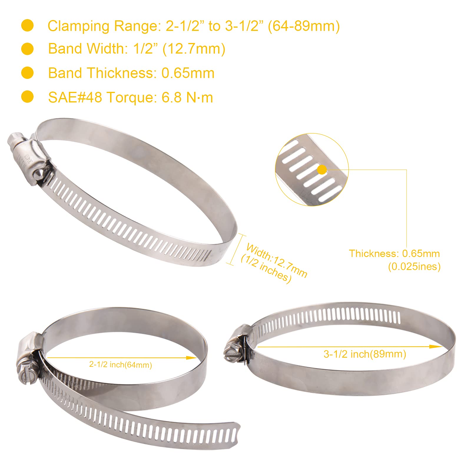 Remarkable Performance: WINL size 48 stainless steel hose clamps are high torque, easy to install, adjustable range, secure hold and smoothly drive. The SAE size #48 hose clamps have clamping range from 2 1/2 inch to 3-1/2 inch (from 64mm to 89mm), great for hose or pipes within this range, perfect as 2 1/2’’(2.5’’) hose clamps, 2 3/4’’(2.75’’) hose clamps, 3 inch hose clamps, 3 1/4’’(3.25’’) hose clamps, 3 1/2’’(3.5’’) hose clamps etc. . The average torque of the hose clamps is 6.8N.