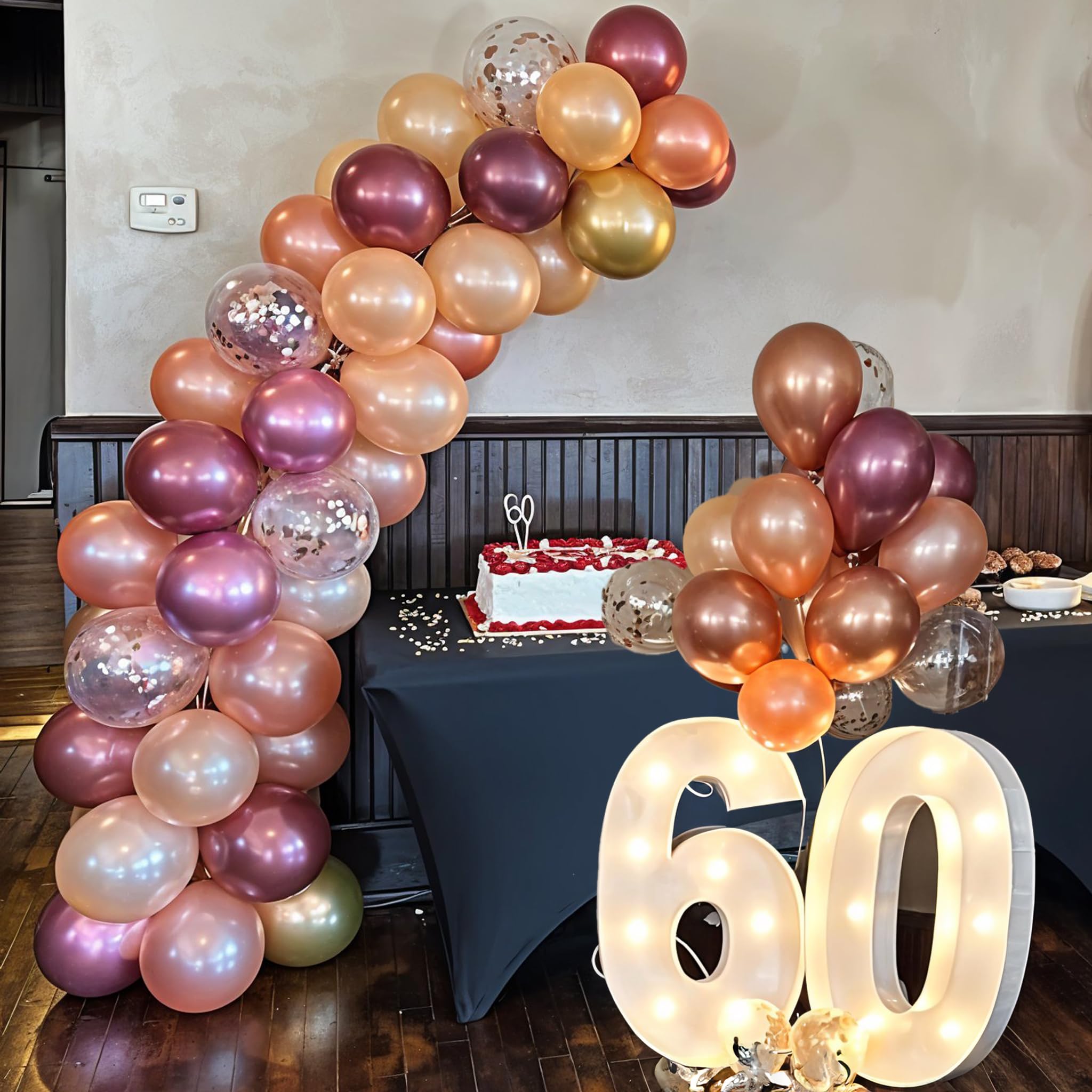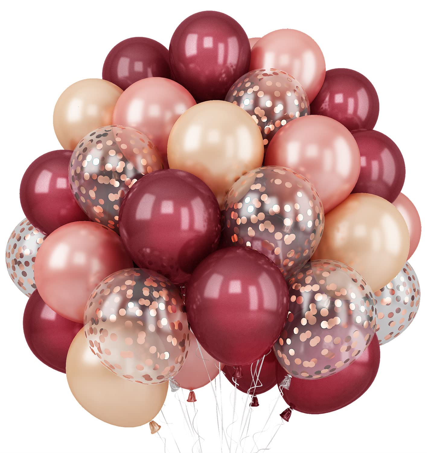 60pcs Burgundy Rose Gold Balloons Set: We offer 15 * burgundy latex balloons, 15 * rose gold confetti balloons, 15 * rose gold latex balloons, 15 * Champagne latex balloons and 2 rolls ribbons, enough shiny to decorate your party. All accessories in the pack are reusable!