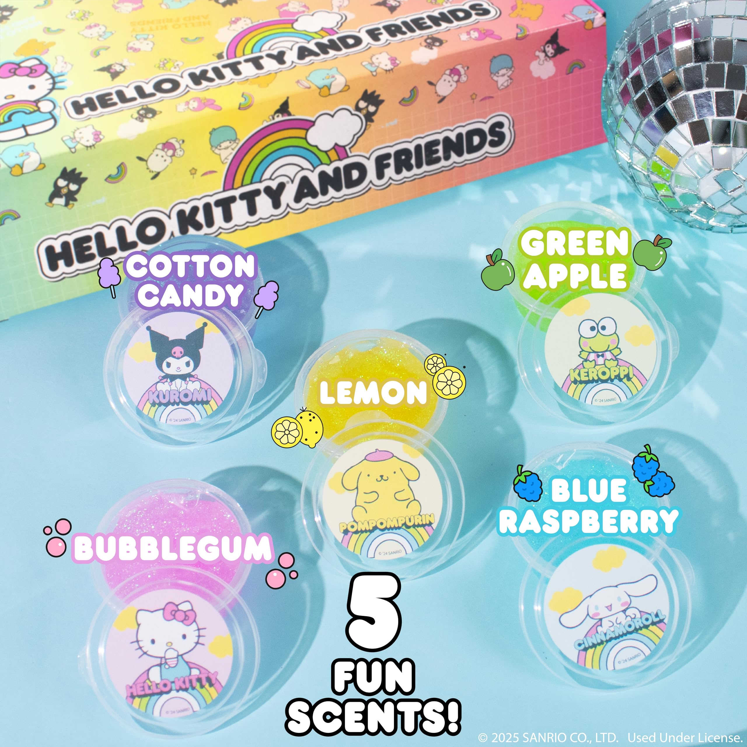 25 SCENTED GLITTER SLIMES: Every sparkly slime has a fun scent and Sanrio character, including Hello Kitty’s pink bubblegum, Pompompurin’s yellow lemon, Keroppi’s green apple, Cinnamoroll’s blue raspberry, and Kuromi’s purple cotton candy.
