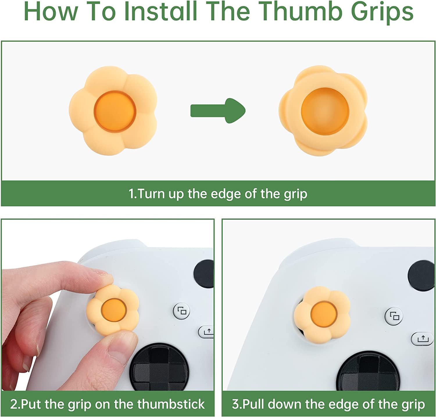 【Easy to Install】① Turn over the joystick caps. ② Align on the joystick. ③ Fall the caps. Please note: Check if the caps wrap the joystick completely to prevent them from pop off when you playing.