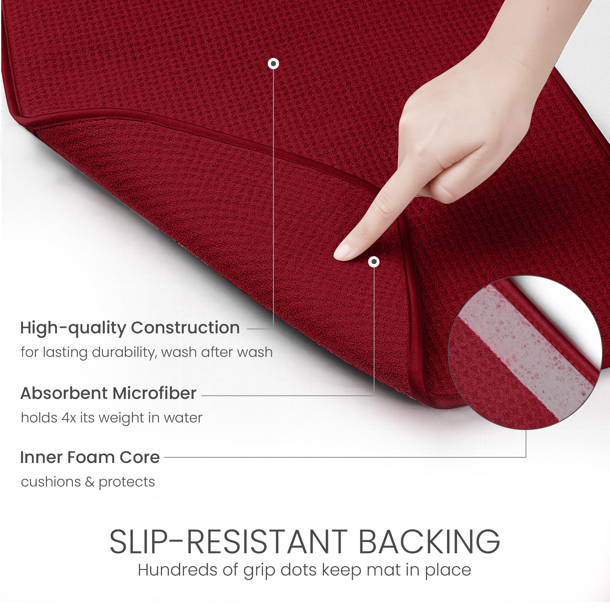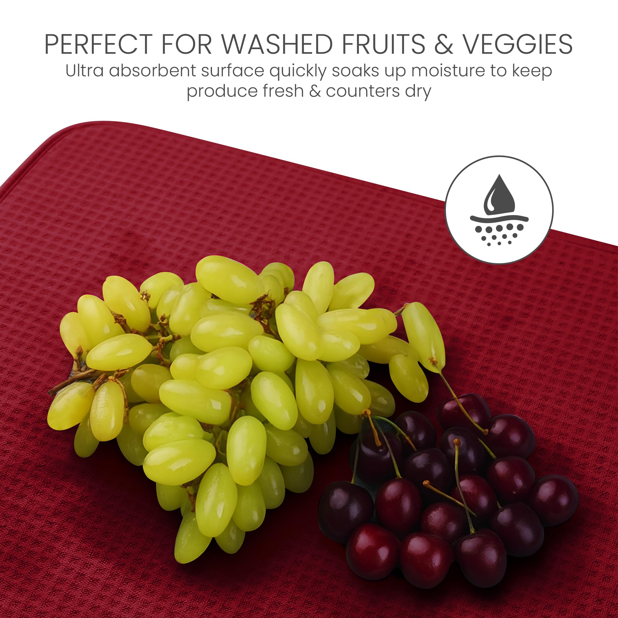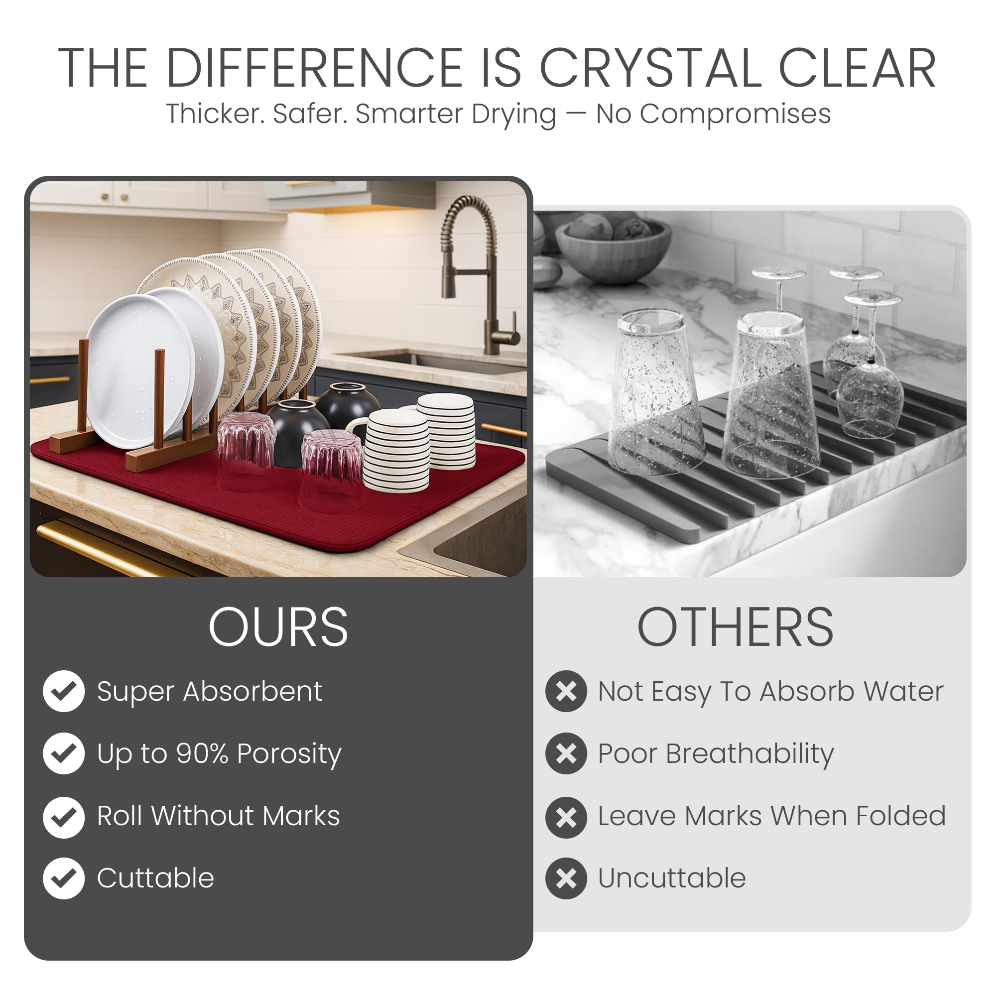 THICKEST , STYLISH MAT | INNOVATIVE HONEYCOMB WEAVE: Keep your counter spotless even while washing a sink full of dishes . Our superbly stylish drying mat is among the thickest on the market today , and its innovative honeycomb microfiber structure enhances absorption and quickens drying time .