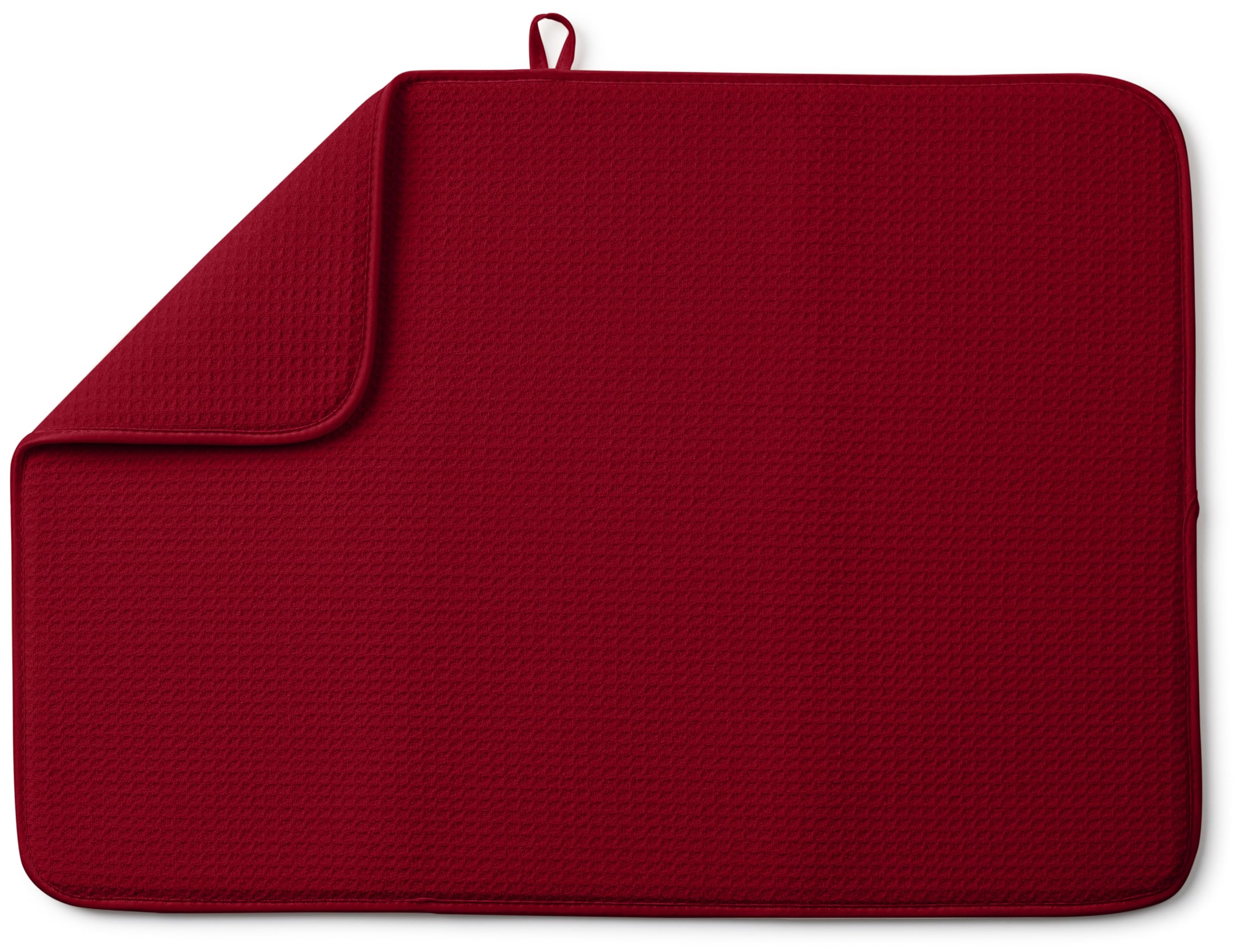 QUICK-DRY HANG TAG | EASY STORAGE: Our manufacturing process creates naturally strong and durable dish-drying mats . Fold up and toss in a drawer or tuck it elsewhere when not in use , and simply hang with the reinforced tag to dry . Our flexible core , folded between high-tech layers of microfiber , can go anywhere !