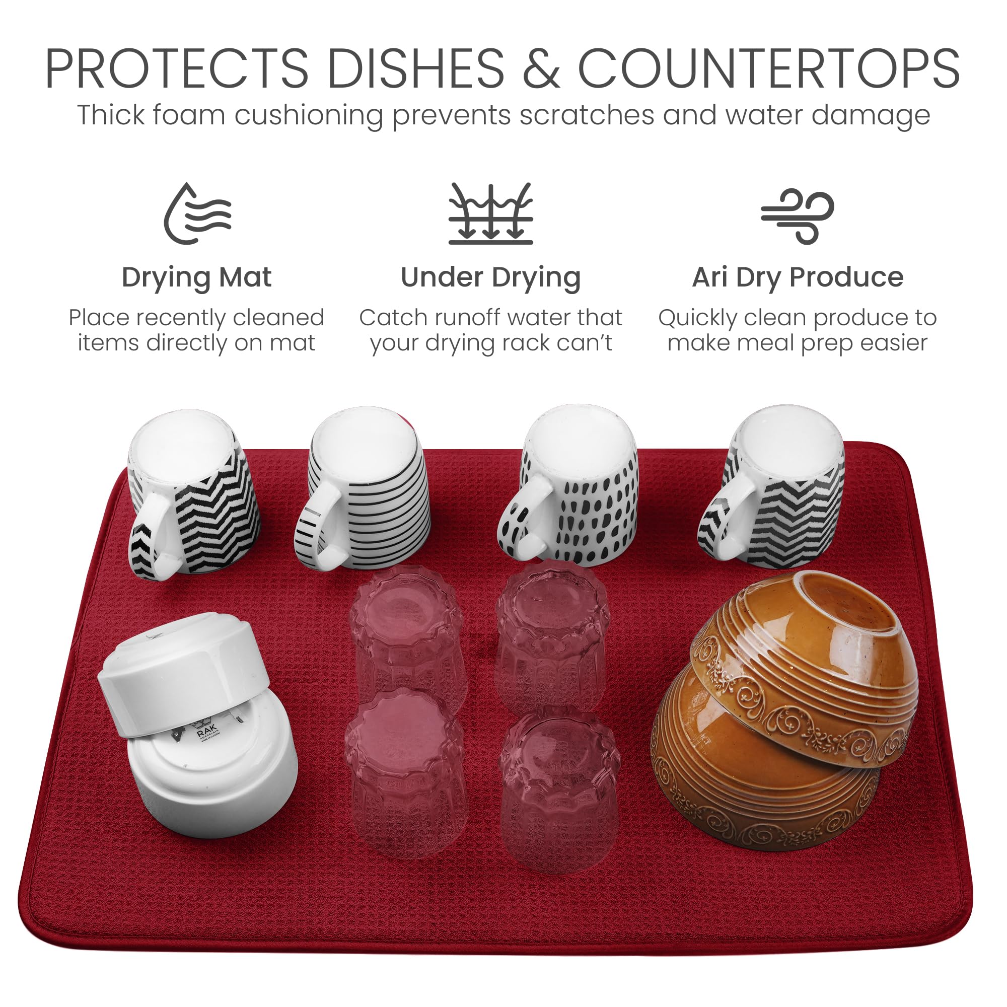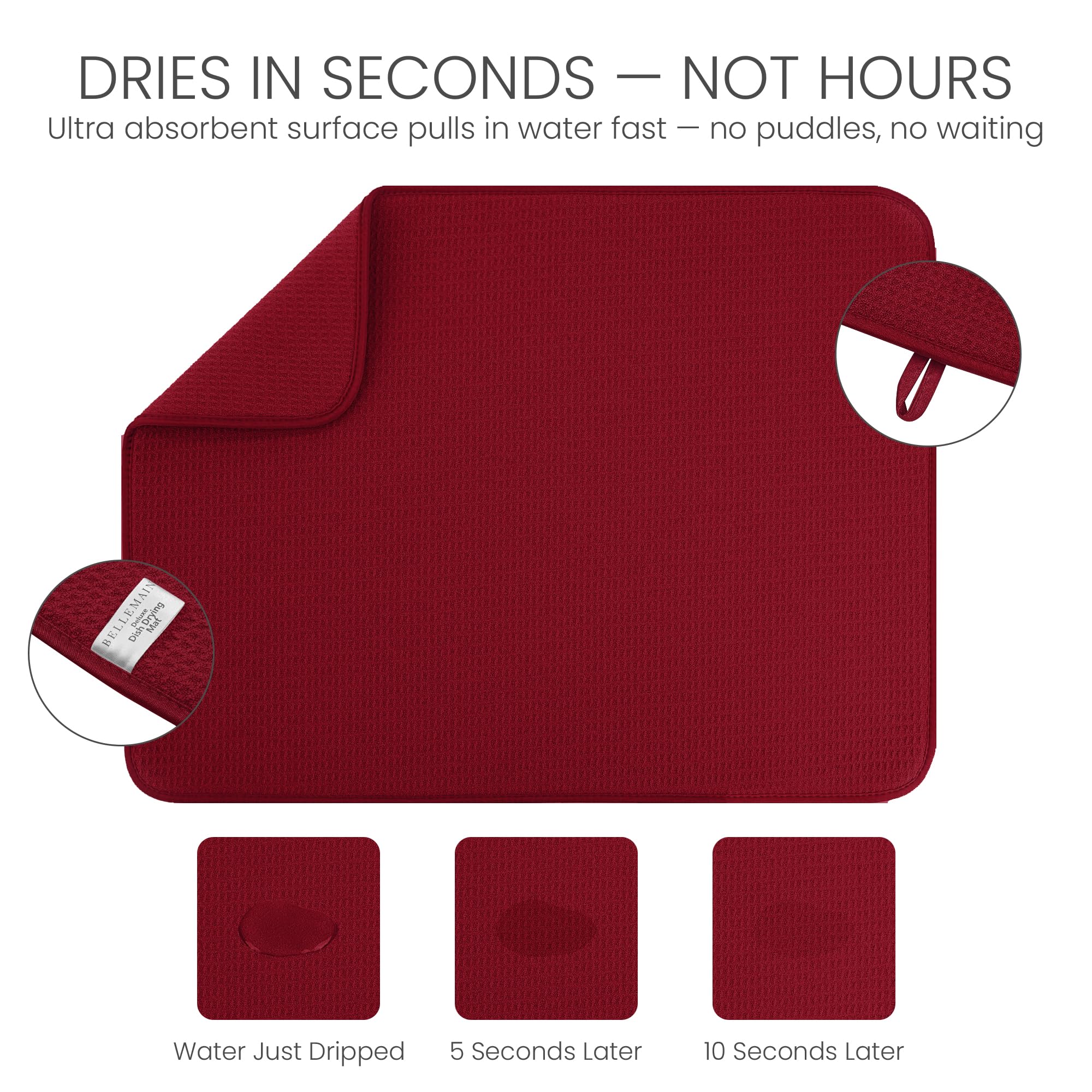 EASILY FITS A FULL SINK OF DISHES | STOP USING TWO DISH MATS WHEN ONE WILL DO: Most dish-drying mats are too small to hold your big pots and pans . Bellemain's extra-large absorbent dish mat is designed to take up nearly 40% more space than the typical mat .