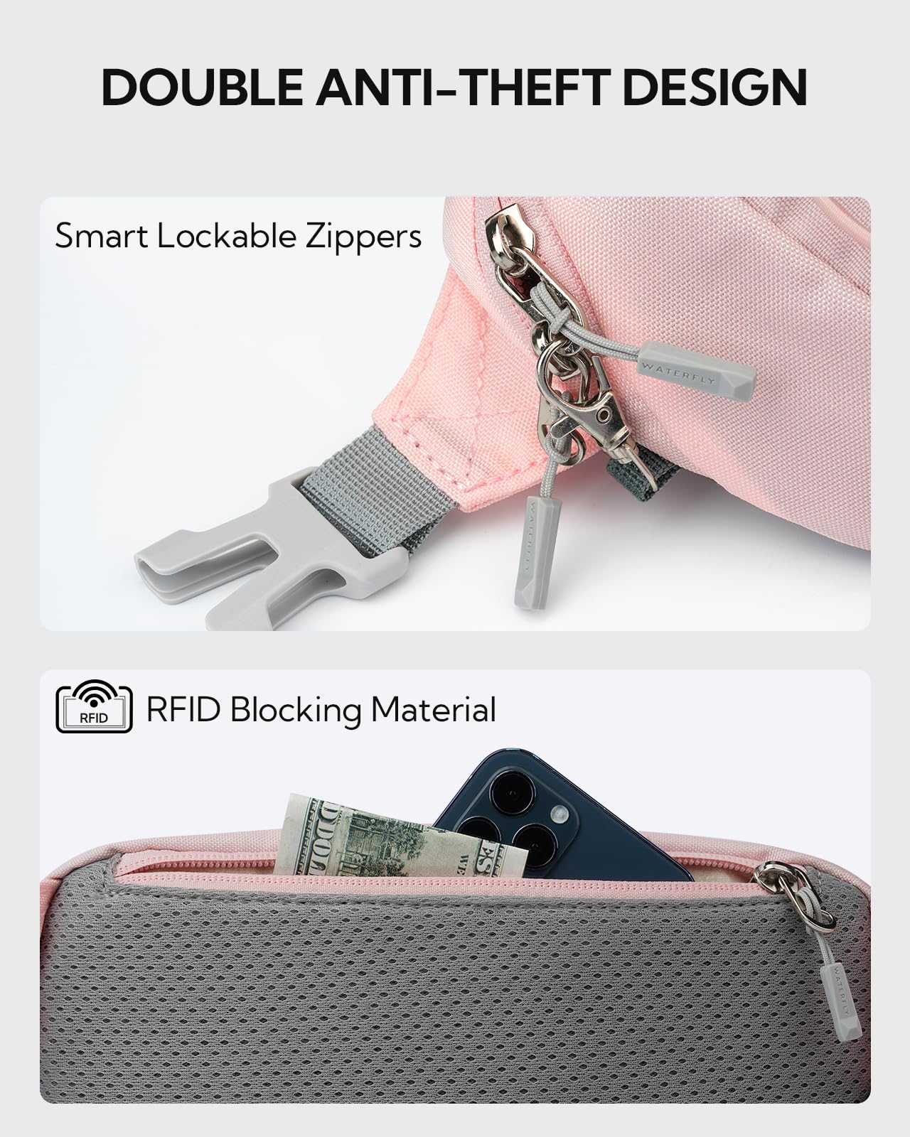 Dual Anti-Theft Protection – Features a lockable front zipper and a hidden rear pocket lined with RFID-blocking material. Safeguards your phone, cards, passport, and cash from both physical pickpockets and digital threats while you're on the move.