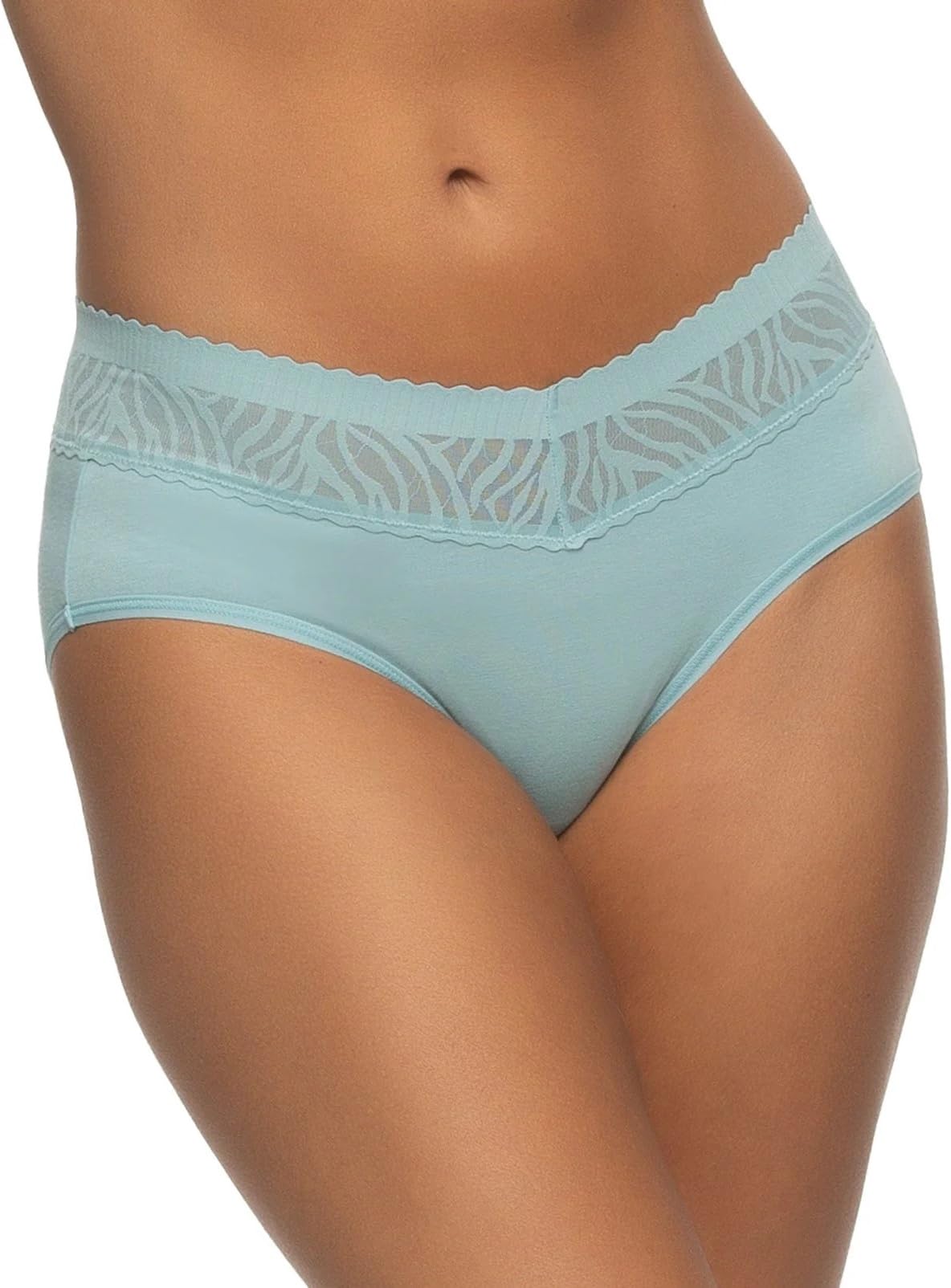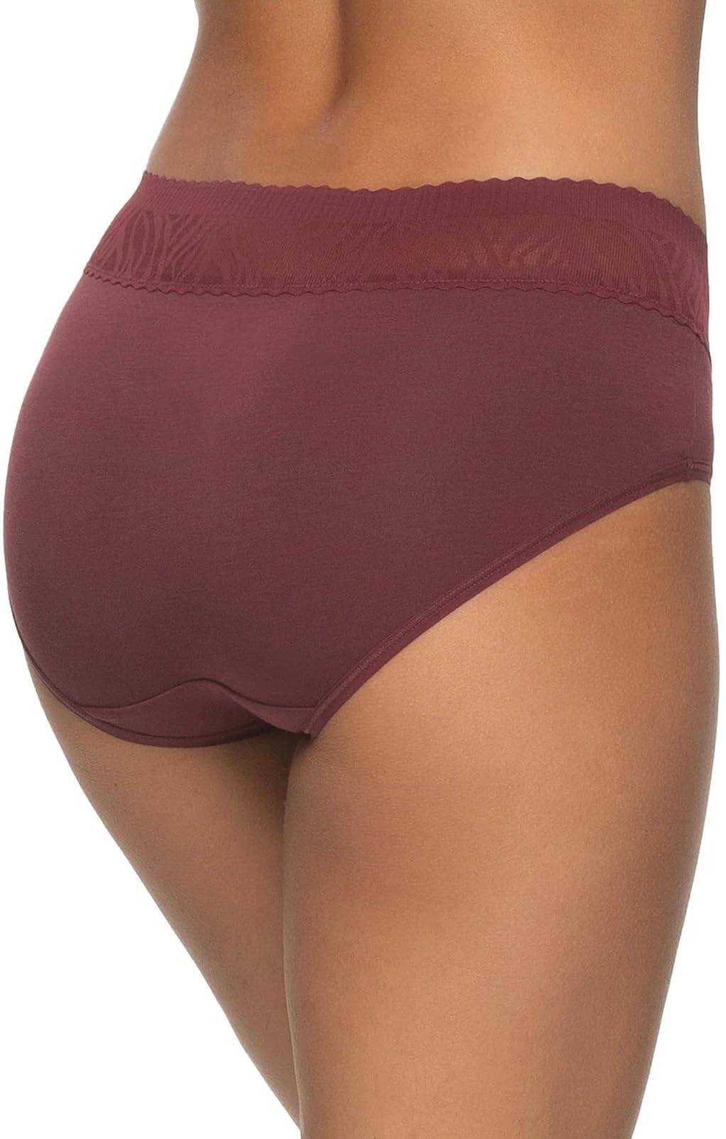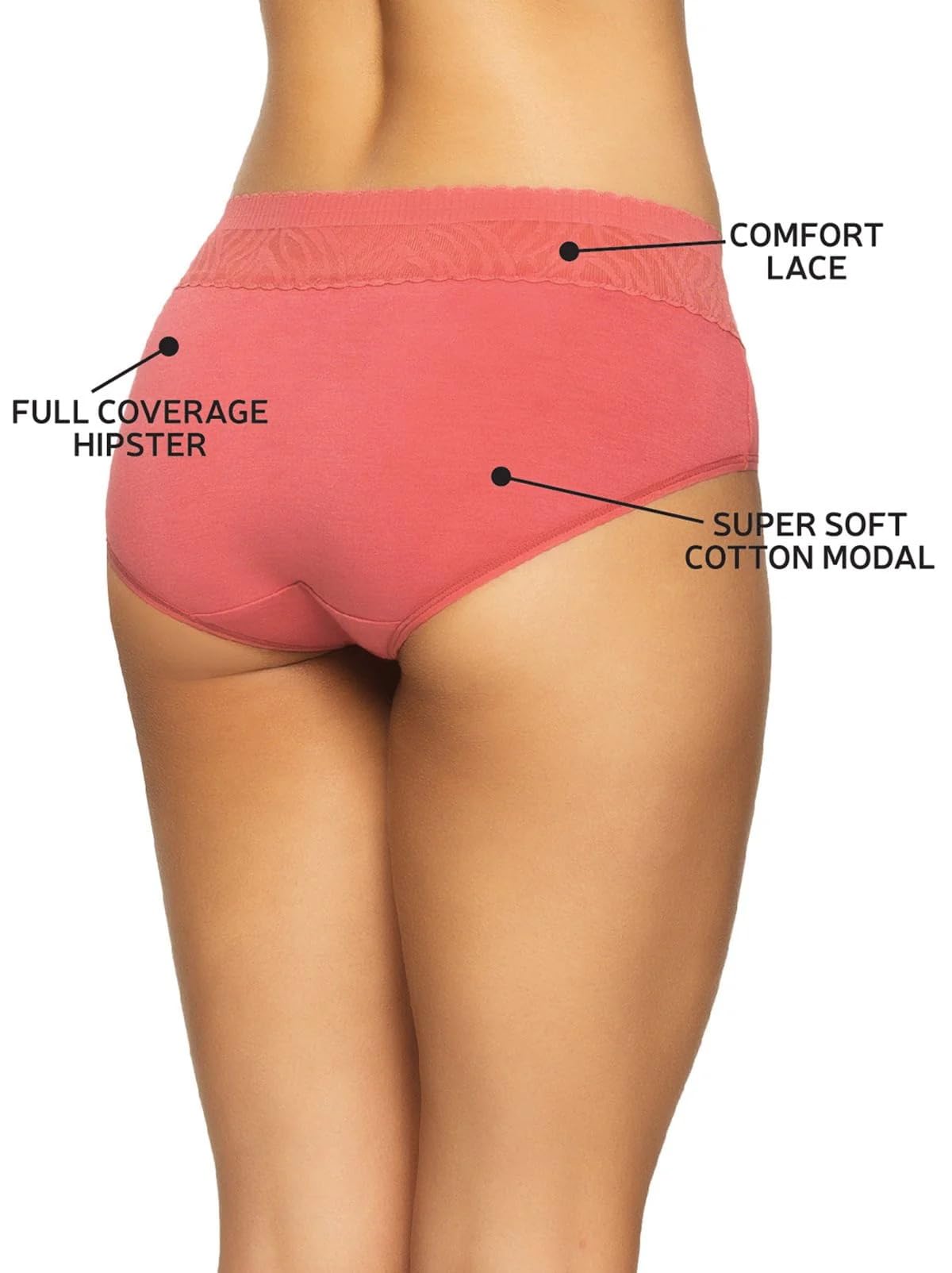Description Our Stay In Place Hipster 5-Pack offers full back coverage with a flat lace waistband that stays put without digging in or rolling, ensuring a smoother look and ultimate comfort. Made from breathable cotton/modal fabric, this mid-waist style is sure to become your new favorite. Featuring stay-in-place technology, a pinch-free, no-dig waistband, and a tagless design, these hipsters offer unbeatable comfort and full coverage. Fabric Content: Body: 56% Cotton, 38% Modal, 6% Spandex Waist band: 72% Nylon, 28% Spandex Sizing: Size Conversion: Small = 4-6│Medium = 8-10│Large = 10-12│X-Large = 14-16 Waist (in): Small = 26½-28 | Medium = 29-30½ | Large = 31½-33 | X-Large = 34-35½ Hip (in): Small = 36½-38 | Medium = 39-40½ | Large = 41½-43 | X-Large = 44-45½