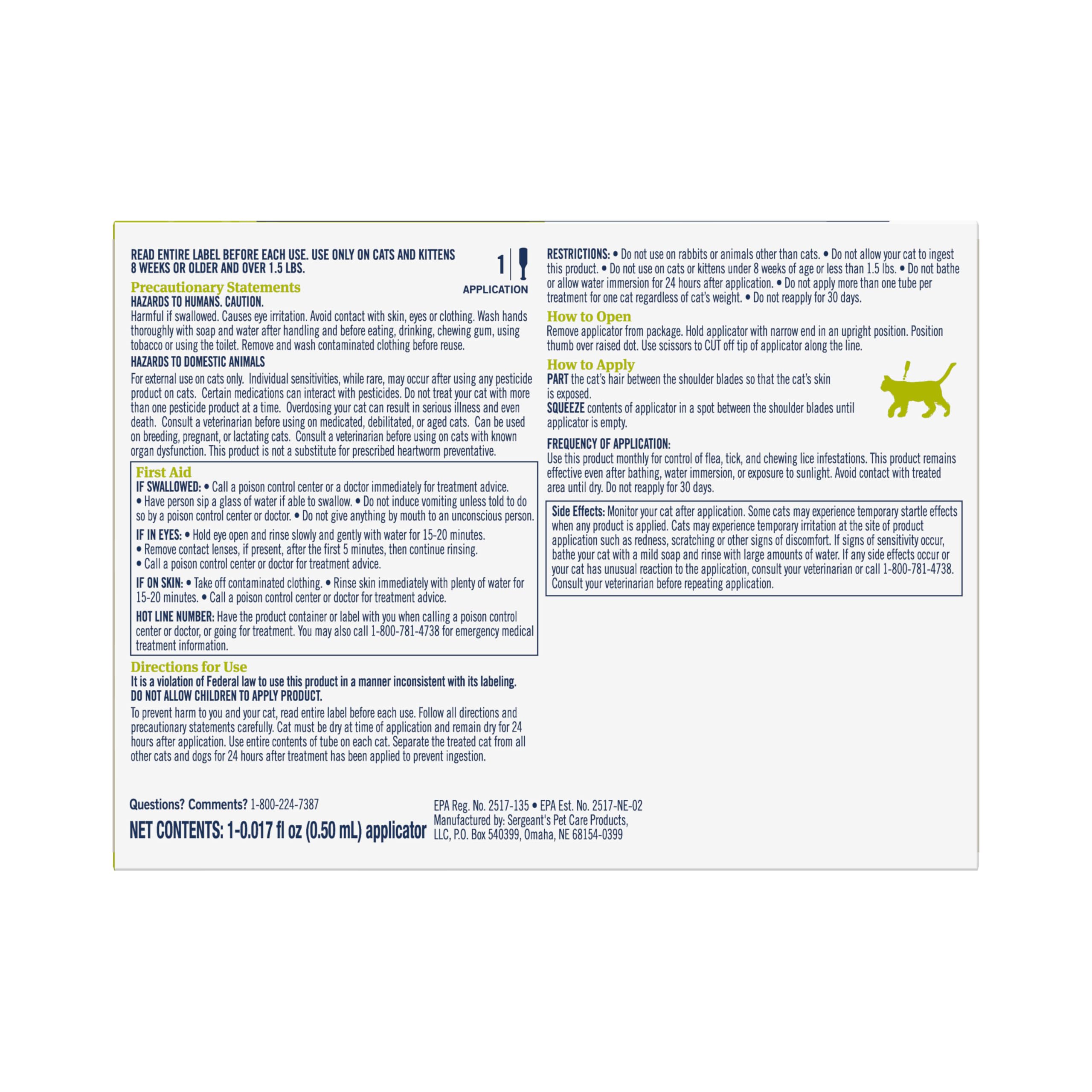 Your pets are family, and PETARMOR helps you confidently care for your cat, especially when it comes to flea and tick control. PETARMOR plus conveniently provides vet-quality protection without the expense of a vet visit. PetArmor Plus Flea and Tick Topical For Cats eight (8) weeks and older who are 1.5 lbs. or larger is a waterproof, fast-acting, long-lasting formula that kills adult fleas and ticks plus stops the flea cycle dead in its tracks. This cat flea treatment has the same active ingredients as FRONTLINE® Plus for Cats. Get nose to tail 30-day protection with each dose at an affordable price. One six-dose package of PetArmor Plus Cat Tick and Flea Treatment offers six months of continuous coverage for most breeds (not recommended for hairless cats).