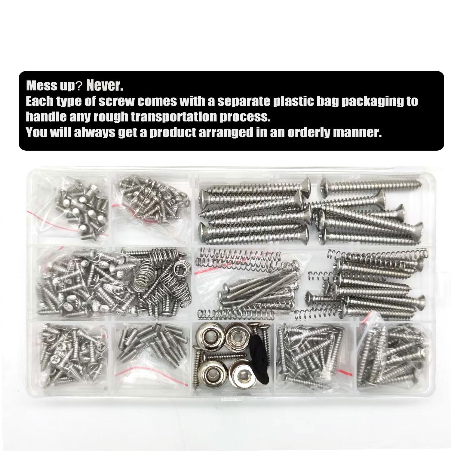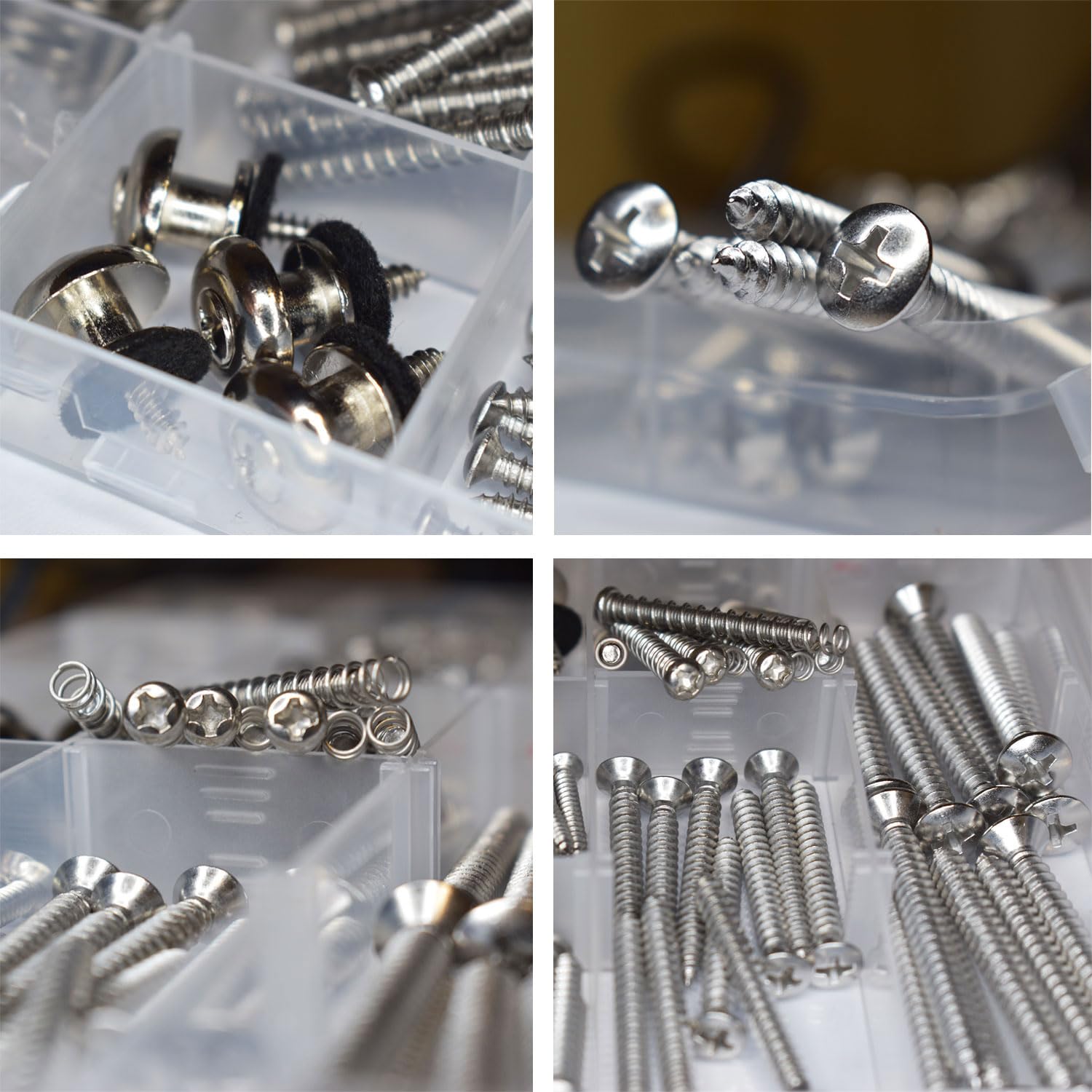 What is important about guitar screw? My answer is: Sturdy,Precise and Beautiful. Yes, All of our screws Made of 304 stainless steel, They are sturdy. Processed by High-precision machine tool, They are precise. Excellent electroplating process, They are beautiful and rust-prevent. The label on the box show where they should be installed, Skip the process of identifying these similar guys. The 12 Types(288pcs Total) as follow: 1.For Selector Switch(20pcs). 2.For Tuner(50pcs). 3.For Neck Plate(12pcs). 4.For Guitar Pickguard(50pcs). 5.For Strap button(4pcs). 6.For Humbucker Pickup(10set, screws & spring per 10). 7.For Tele Bridge(10pcs). 8.Singlecoil pickup(10set,screws & spring per 10). 9.For pickup ring(20pcs). 10.For Strat Bridge(12pcs). 11.For Gibson Pickguard(50pcs). 12.For Bridge Height(20pcs). These rich contents determine its wide applicability. Should all of the 12 types screws fit for my guitar? There are so many brands of guitars, we can only provide some of the most commonly used sizes. We can guarantee that it fits most electric guitars, but not all. Suggestion comes from us: For most Fender electric guitars, all of 10 types should fit, we recommended this kit. For Gibson LP, Epiphone Series, May not get full marks, but should still 5+ types screws suitable, please decide for yourself. For Other brand, we can't give advice on adaptation, please decide for yourself.