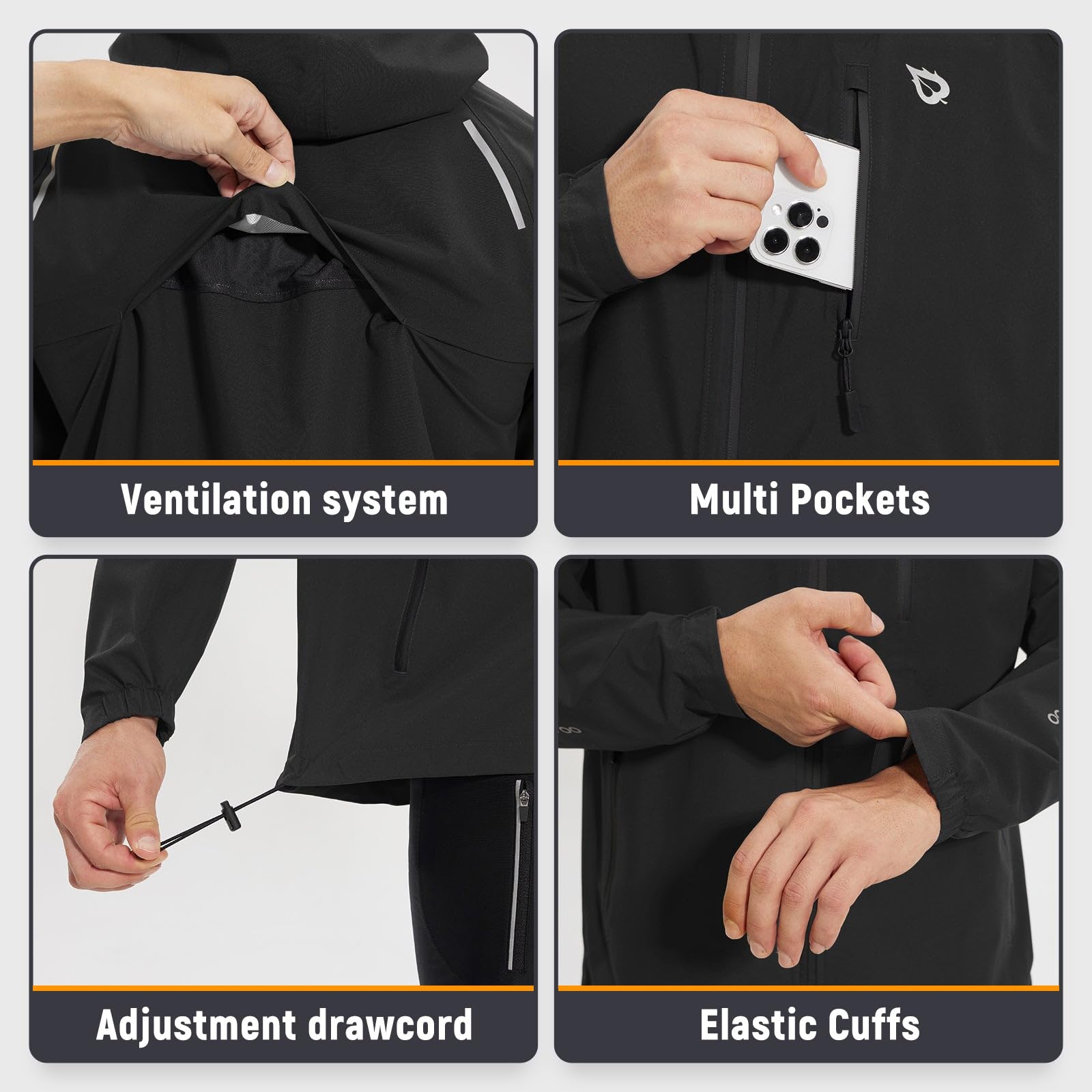 Packable Hood: Mens cycling rain jackets with hood features drawstring hooded to adjust the width and height, large enough to accommodate road riding and climbing helmets. The hood can be tucked into a velcro compartment by the collar when not in use.