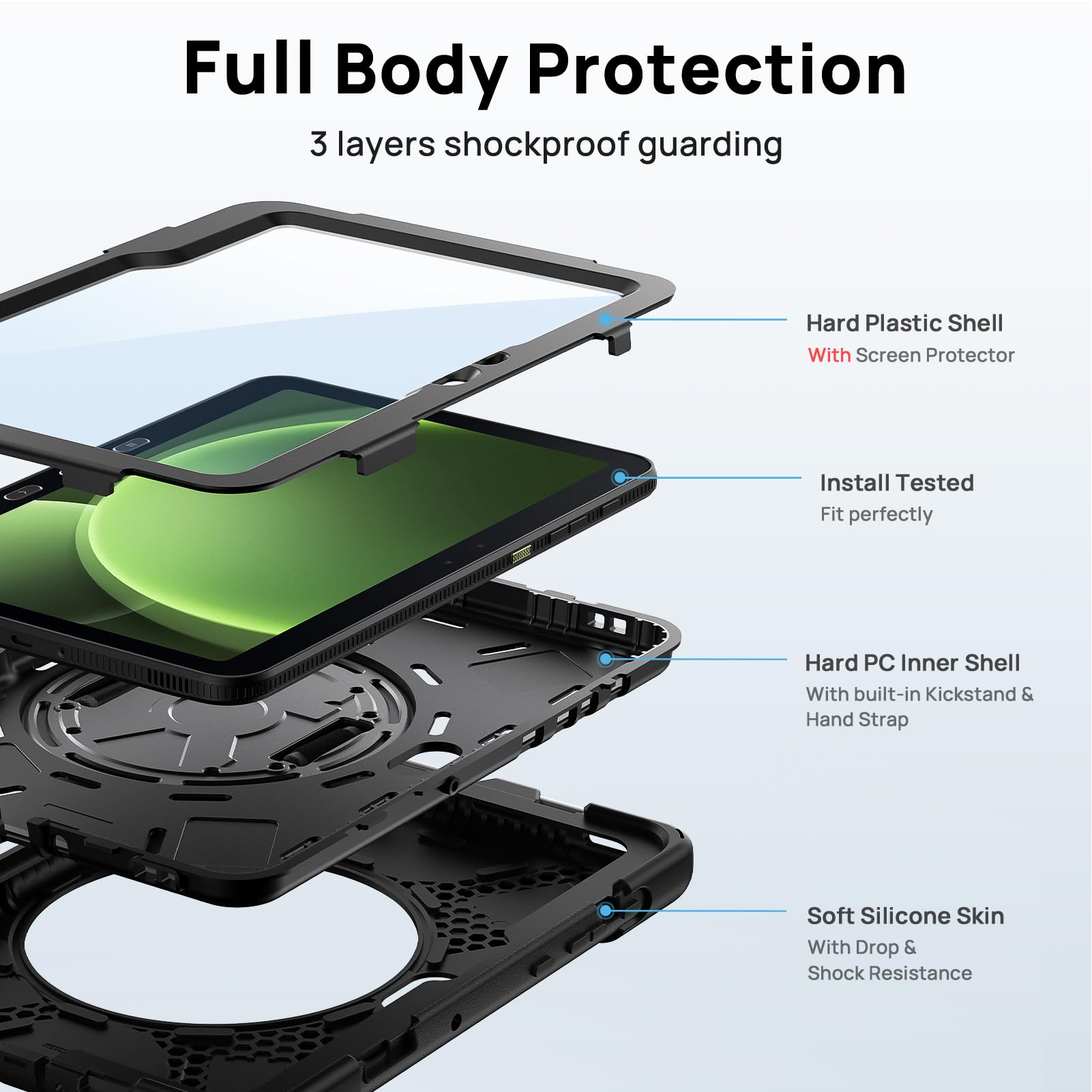 [Armor Protective Case]: 3-in-1 design, hard polycarbonate inner layer protect your Galaxy Tab Active 5 Pro from drops, dirt, damage and bumps; Soft silicone outer layer provides anti-slip, anti-scratch and shockproof protection function