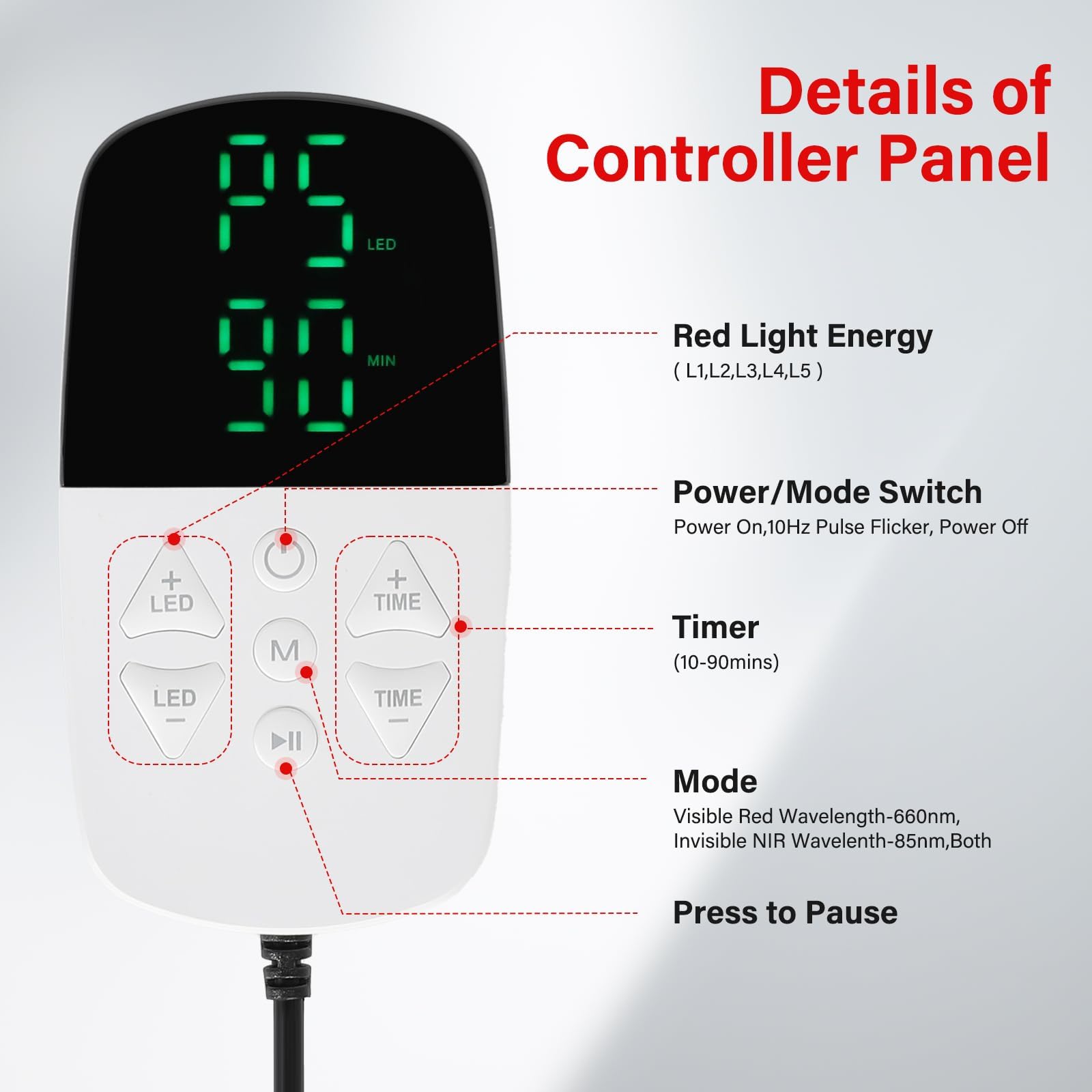 Multiple Modes for Customized Relief: Choose from three modes: 660nm red light, 850nm near infrared light, 660nm+850nm mode. Each mode offers 5 adjustable strength levels for optimal effectiveness. press "LED + -" to change the light intensity, P1-P5 from low to high. Built-in overheating protection chip.Perfect for sports injuries, stiff neck and shoulders, back pain and muscle soreness.Requires an electrical outlet for use.
