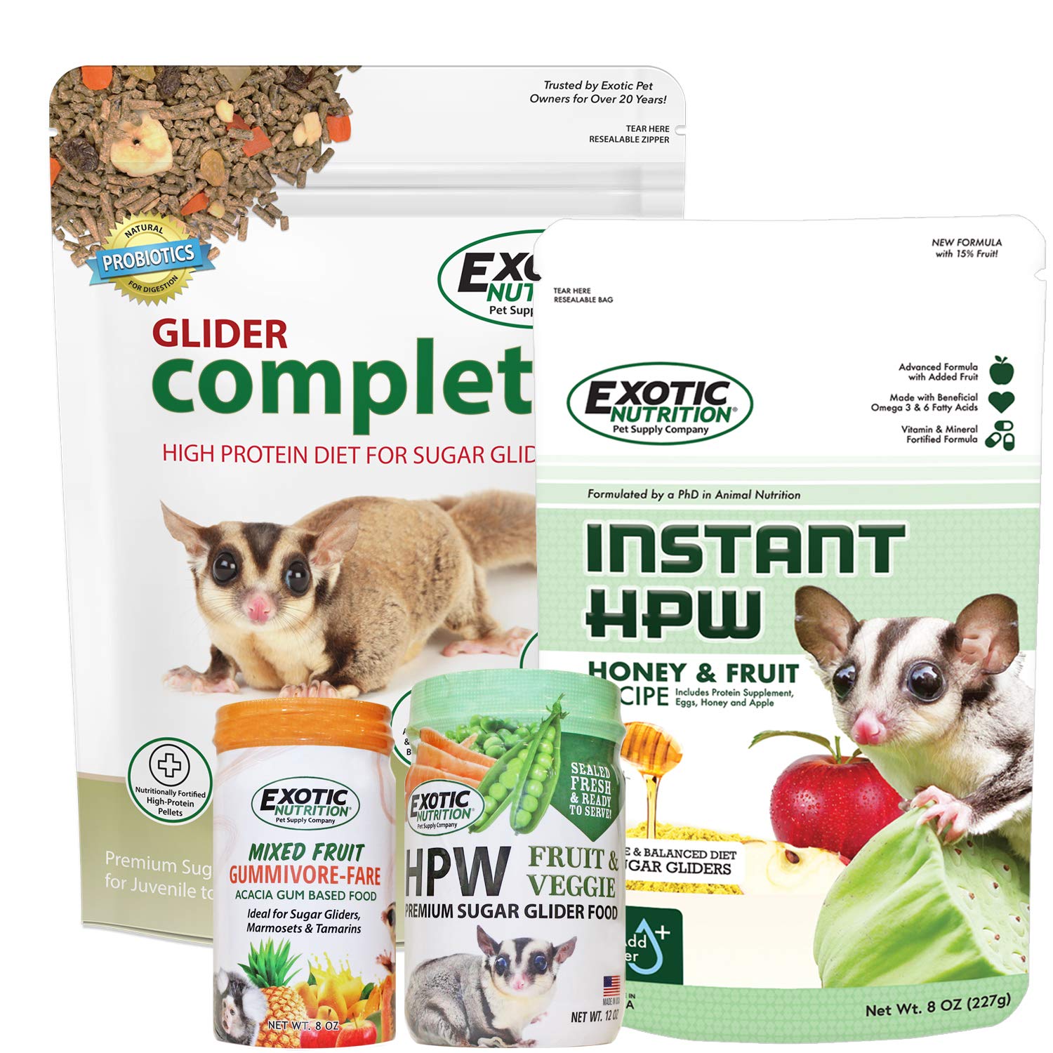 New sugar glider owner or just looking to change your pet's diet? Exotic Nutrition's Glider Complete Food Starter Package includes everything that you need to begin feeding your glider a healthy, complete diet. INCLUDES: Glider Complete 2 lb. and Instant-HPW Honey, Fruit Recipe 8 oz., Mixed Fruit Gummivore-Fare & HPW Fruit & Veggie FEATURES: ✔ HEALTHY - Glider Complete is a nutritionally fortified pellet, mixed with 8 varieties of real fruit chunks! ✔ NUTRITIONAL - High-protein pellet diet provides your sugar glider with exactly what is needed for proper growth and development. ✔ CONVENIENT - Instant-HPW is a vitamin-enriched, powdered sugar glider diet that mixes with water to form a soft, pudding-textured food. ✔ TRUSTED - Instant-HPW includes the major ingredients from the original High Protein Wombaroo (HPW) diet that is trusted and fed to sugar gliders worldwide .✔ 100% NATURAL - No artificial colors, flavors, or preservatives FEEDING INSTRUCTIONS: Offer approximately 2 tbsp of Glider Complete and ½ tbsp of HPW to your pet daily. Adjust the amount to ensure your pet's optimum body weight (free choice for pregnant or lactating females). Additional vitamins are not necessary if your glider's diet is made up of at least 75% Glider Complete. We recommend putting out moist foods at night when your sugar gliders wake up, so that it does not sit out for long and dry up. Do not leave moist food out for more than 12 hours, change out pellet food every 24 hours. Always provide fresh drinking water to your sugar glider.