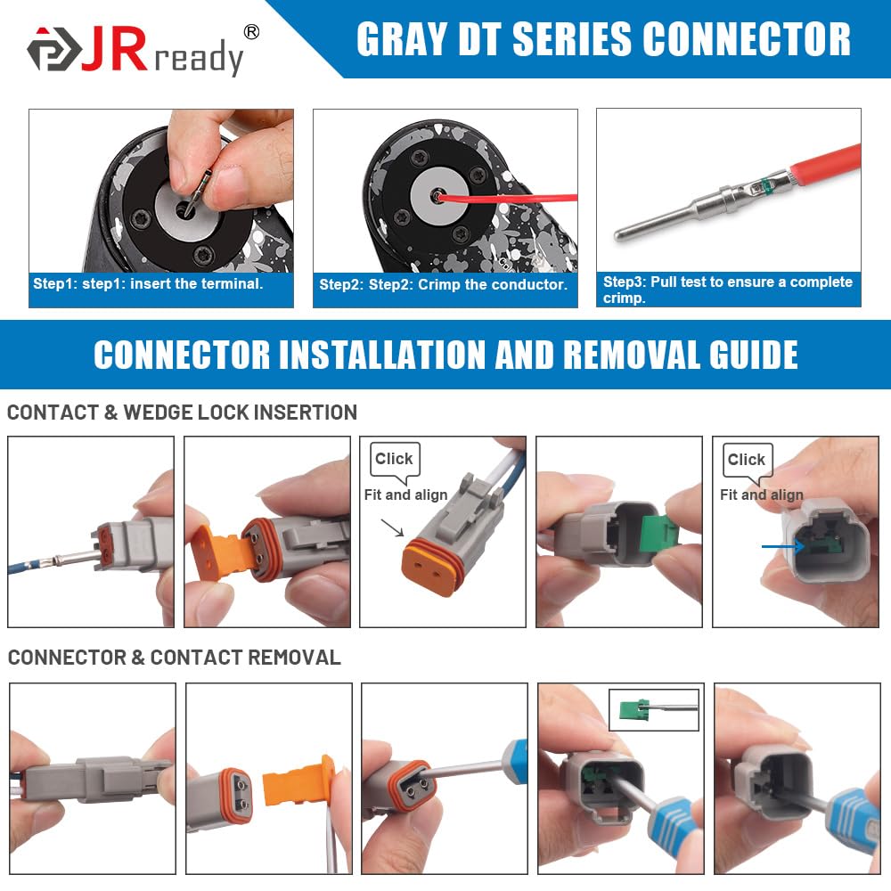 Applicable Crimping Tools: Recommended JRready ACT-DT1 crimping tool. This Deutsch crimping tool is suitable for crimping 12# 16# 20# turned pin/socket contacts.