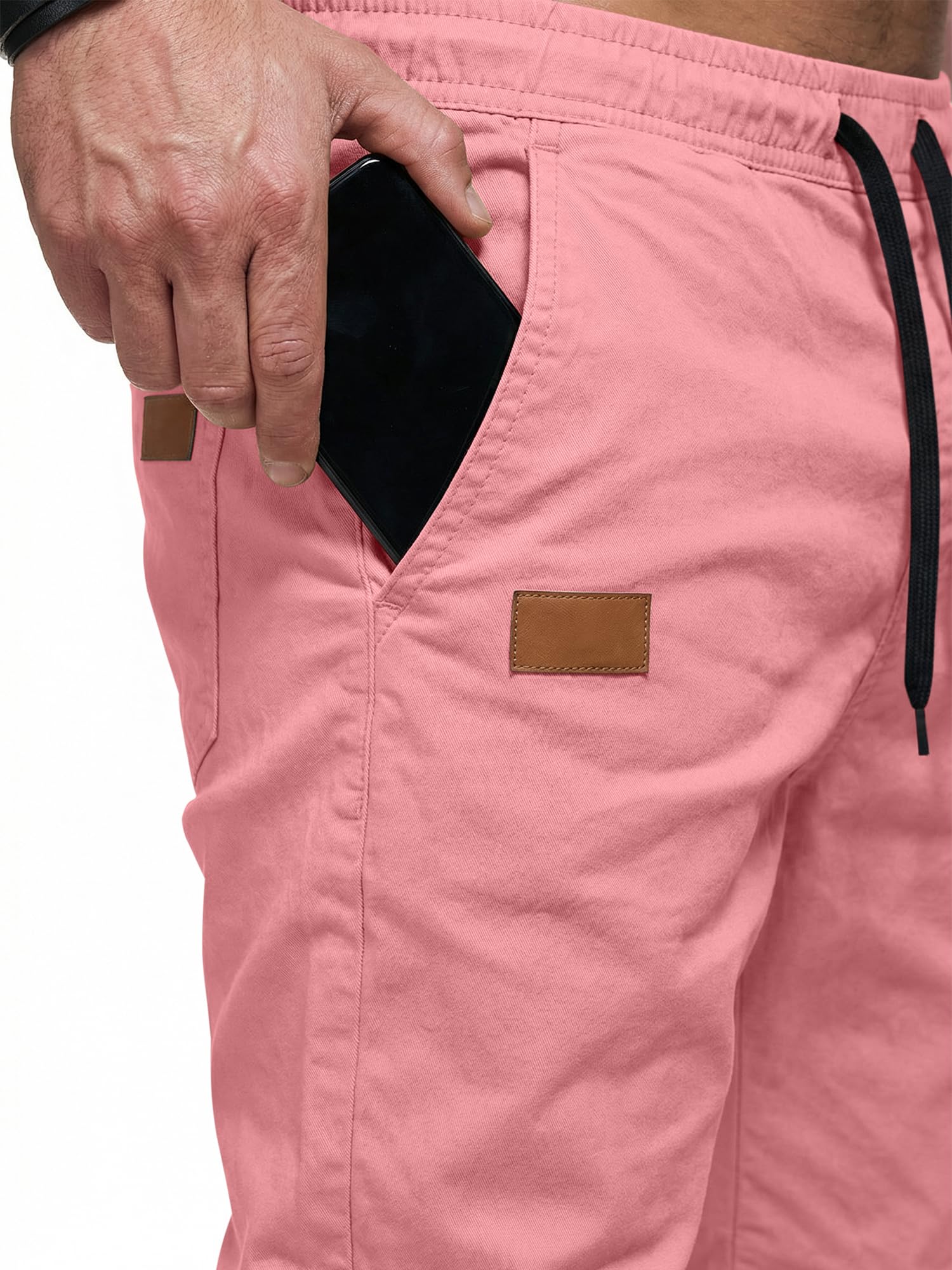 Practical Pocket Design: Features deep side pockets and classic back pockets to securely hold your phone, keys, or wallet, accented with a stylish leather patch detail for a modern look.