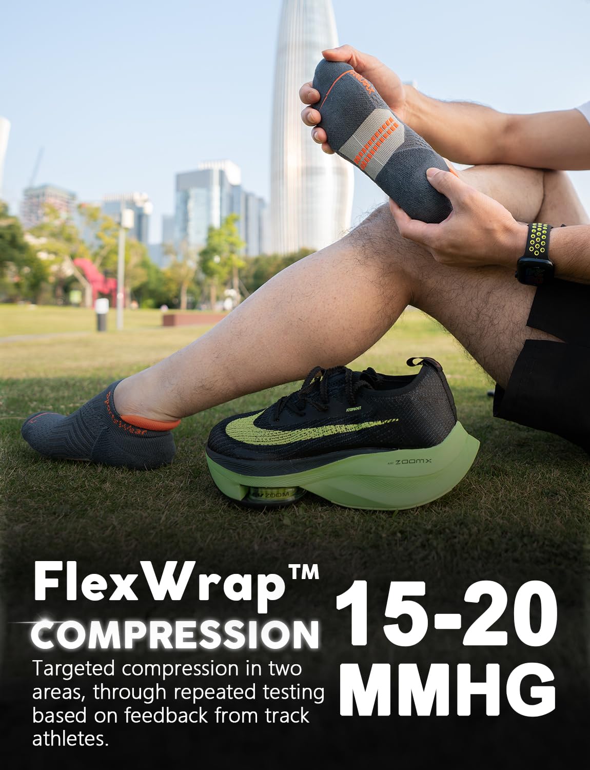 【Flexwrap Compression】: With 15-20mmHg targeted compression for the arch and calf, these socks reduce muscle vibration and fatigue, enhancing performance during your runs, basketball games, tennis matches, golf outings, hiking adventures, and cycling trips. Enjoy quicker recovery times, making them ideal for athletes in any sport.