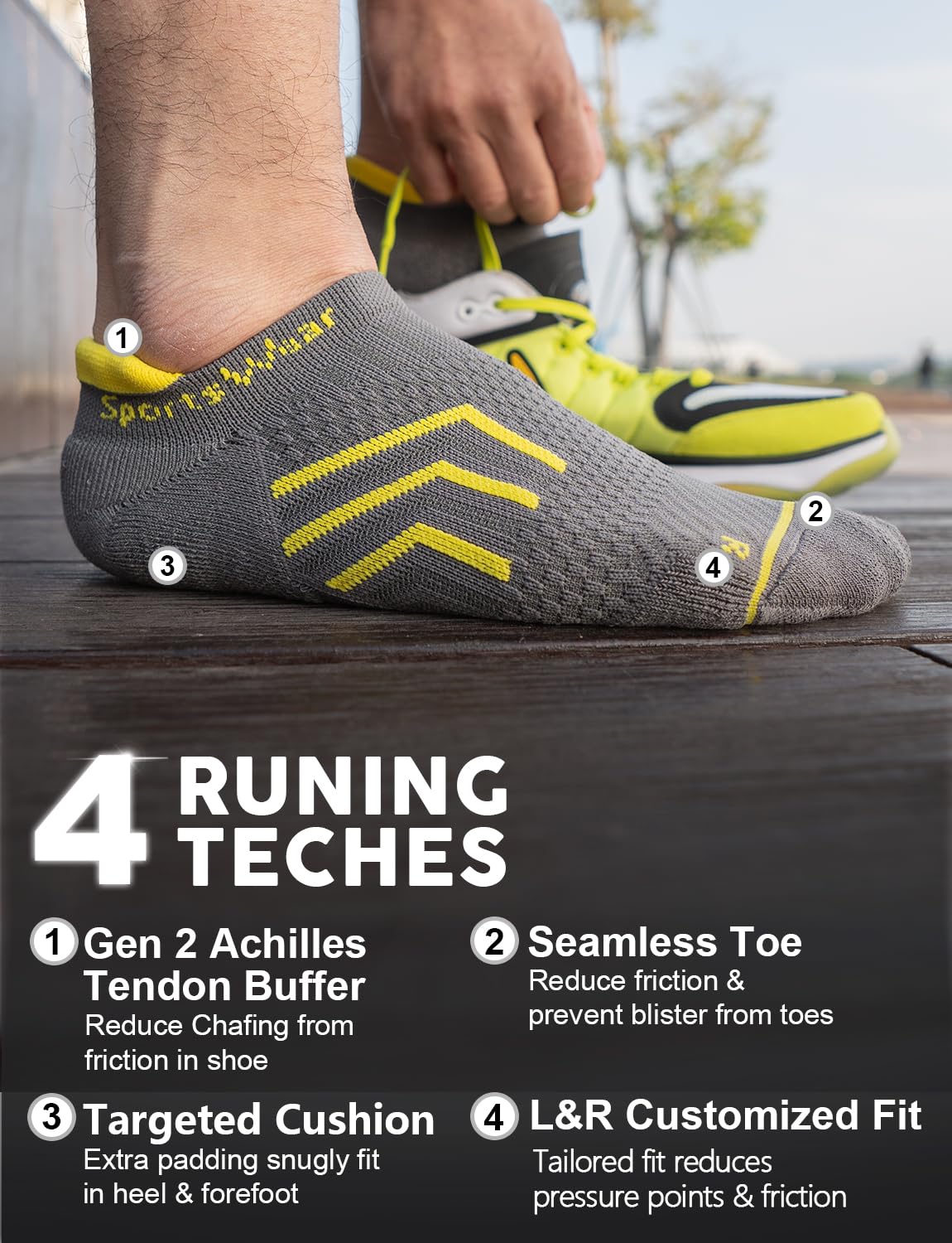 【Enhanced Arch Support & Locking Heel Tab】Say goodbye to foot fatigue and heel slippage! Our hidden grip heel tab locks the sock securely during intense sprints, while the targeted arch compression provides essential stability and reduces muscle strain. Lightweight and invisible under shoes – run farther with unwavering support and zero distractions!