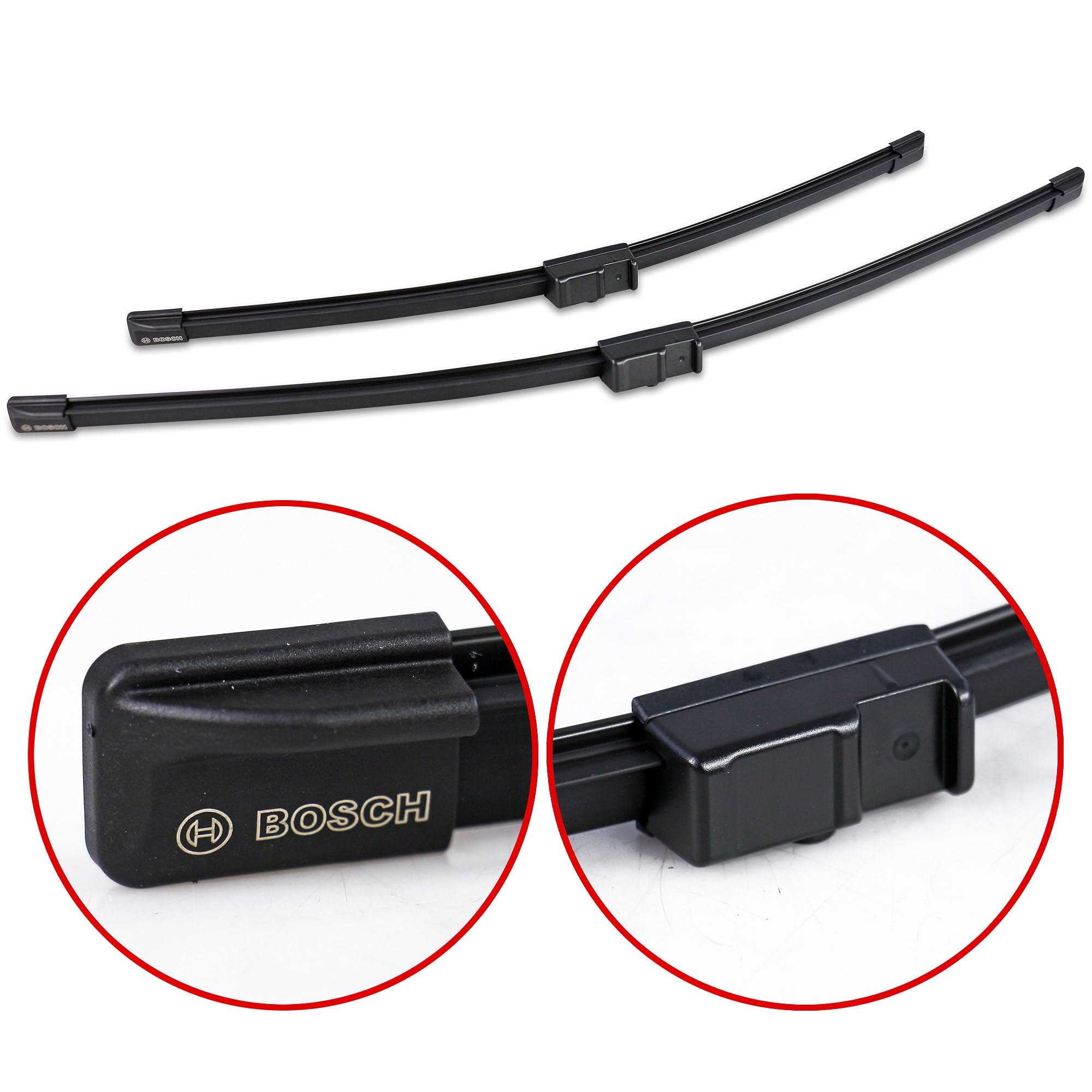 Bosch AeroTwin's patented beam design contains no metal or plastic brackets, joints or hinges, offering an ideal technology upgrade for vehicles originally fitted with conventional wiper blades. The specially blended dual rubber compound with graphite coating removes even the smallest traces of water for exceptional all-weather visibility and smooth, quiet operation. Specific beam curvature for OE specialty wiper arm types, coupled with dual precision-tensioned steel springs, ensures uniform pressure along the entire blade length for crystal clear visibility. Built-in asymmetrical wind spoiler uses air flow to increase blade-to-windshield contact - for consistent performance at highway speeds. Wind spoiler also serves to protect the tension springs from damage by severe weather elements for increased durability and long life. Pre-assembled OE style adapter provides OE fit and function for simple, easy installation on specific vehicles. Set of 2. Note: AeroTwin wiper blades are designed to fit vehicles with specific wiper arm connnection types - they are not universal fit wiper blades. Please verify specific vehicle fitment details with fit checker above.