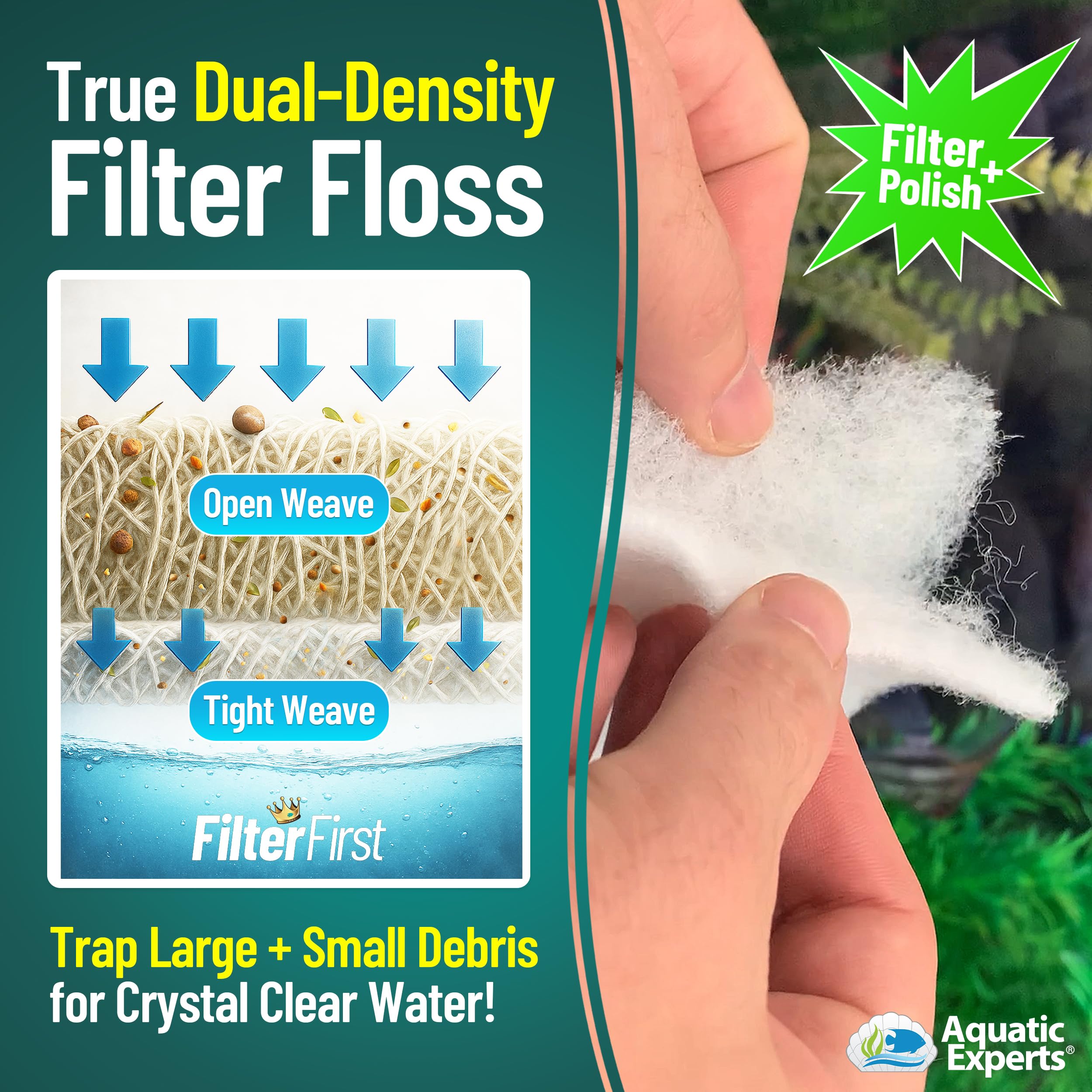 IMPROVE WATER QUALITY- Place our FilterFirst DUAL ACTION POLYFILTER PAD in flowing water with the open weave side up to trap uneaten food, waste, decaying plants, detritus, and other large and fine floating particulates from the water. Changing filter media pads regularly will INCREASE WATER QUALITY by removing solid organic compounds before they continue to break down and add additional nutrients to the water in your fish tank.