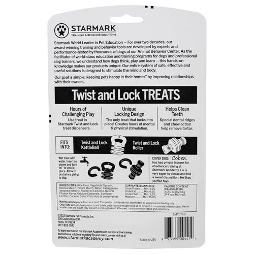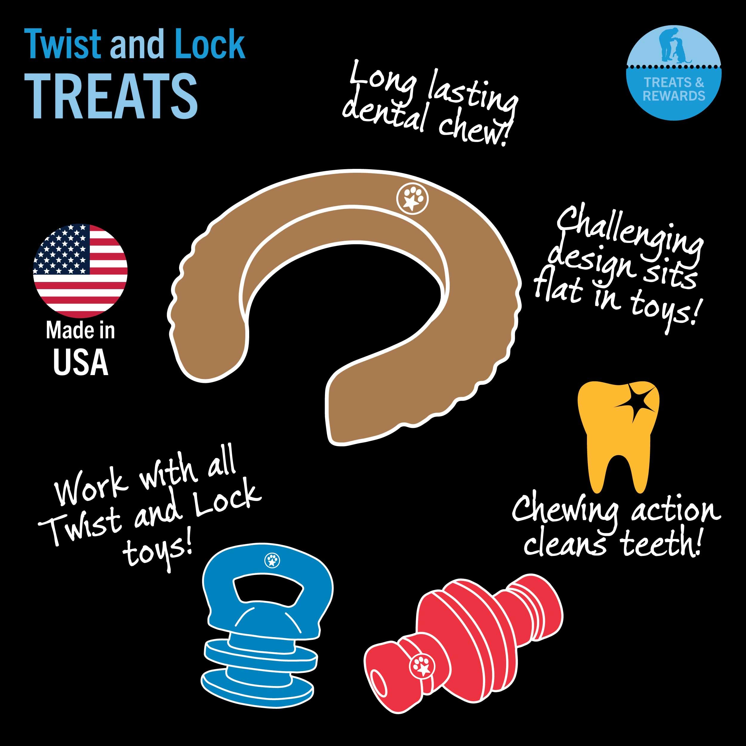 Starmark Twist and Lock Treat long lasting dental chews for dogs help safely remove plaque and tartar through chewing action for healthy teeth and gums. These edible and digestible treats are designed to grind down gradually like a natural bone. They fit all Starmark Twist and Lock Toys to provide interactive chewing fun for your dog. Available in Chicken flavor dogs love. Made in USA.