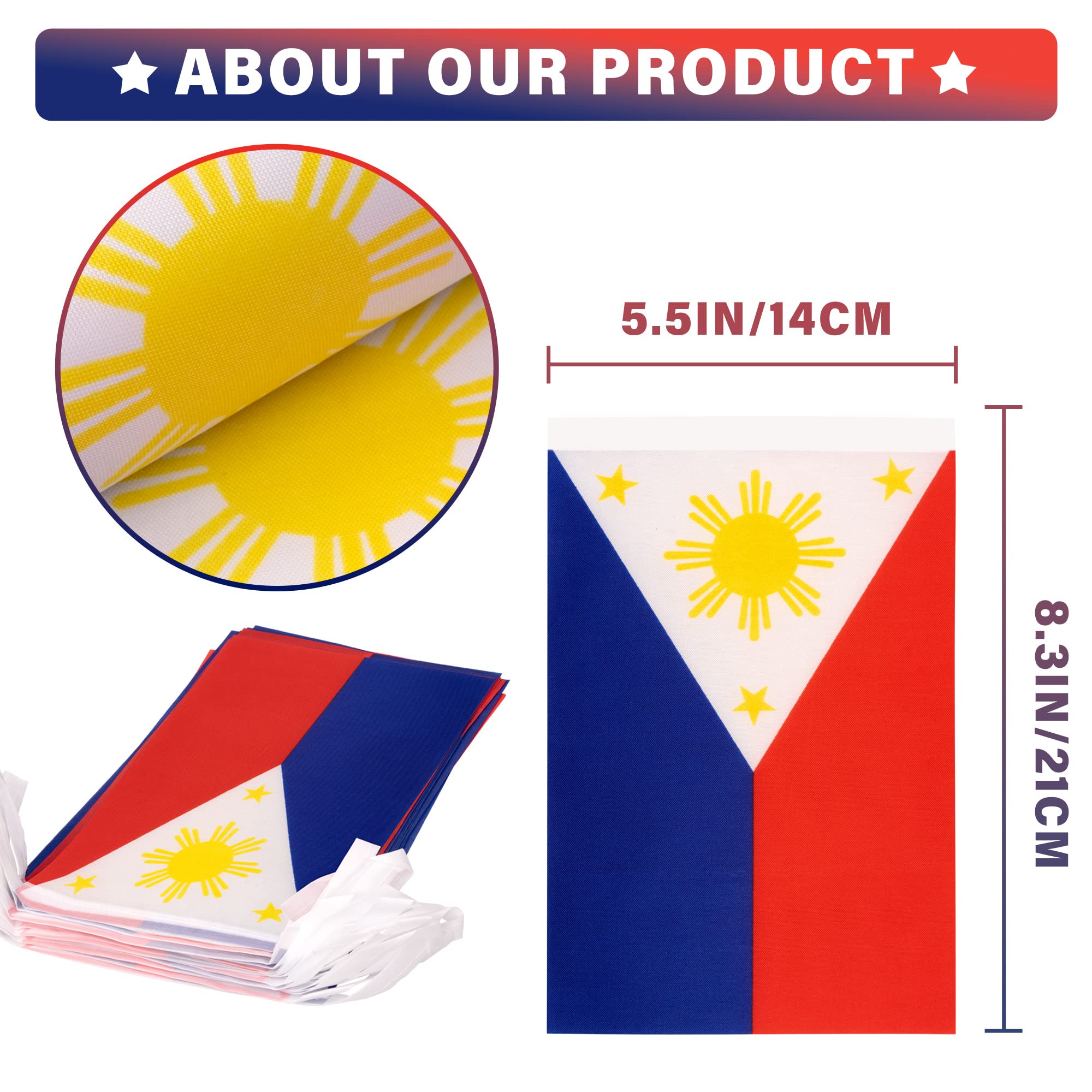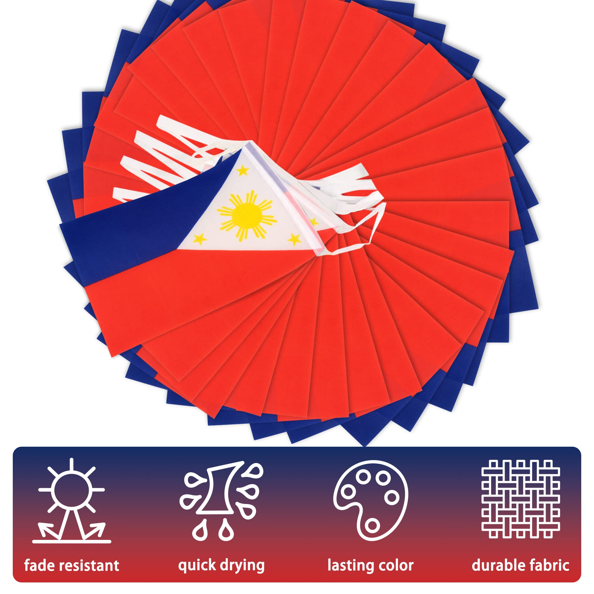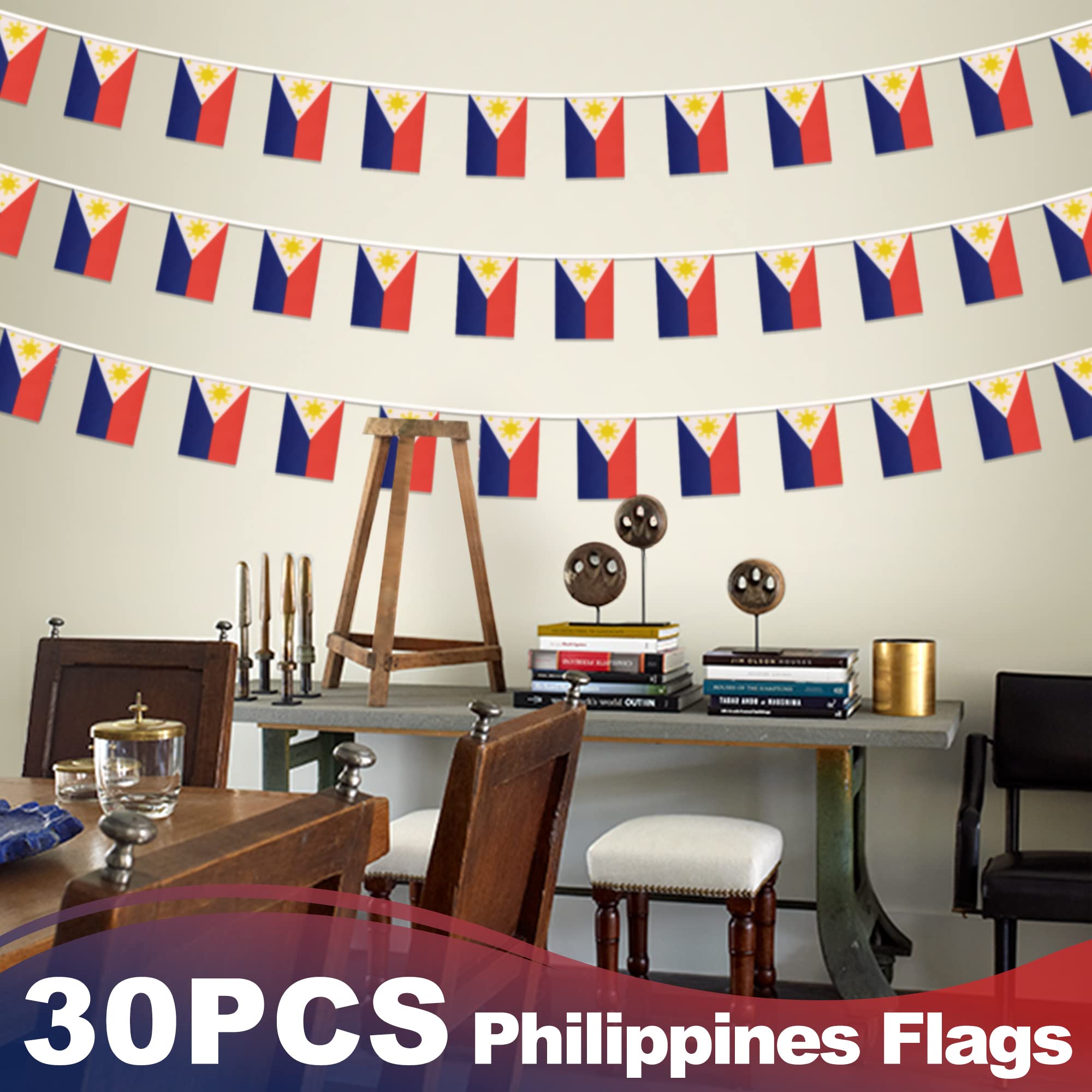 【Specifications】Each string is approximately 33 feet long. Includes 30 pcs Filipino flags. Each flag is approximately 5.5 in wide and 8.2 in long.