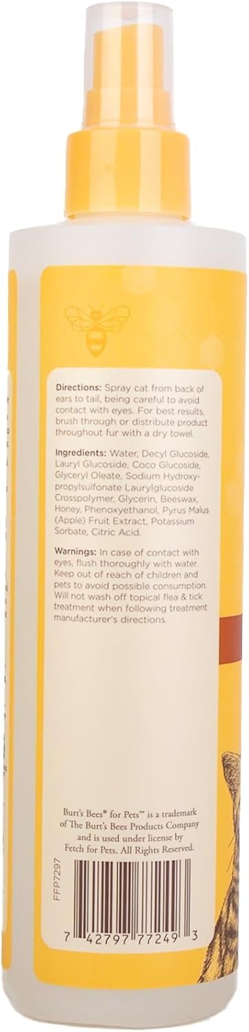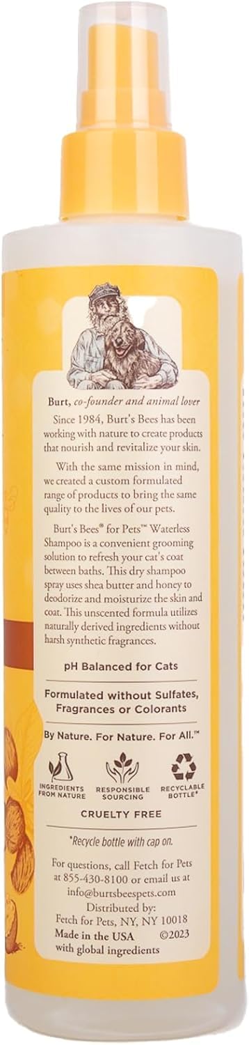 Burt’s Bees for Pets Waterless Cat Shampoo Spray is a no-rinse way to refresh your cat’s coat when a full bath is not an option. The fine mist helps lift light dirt and everyday odors so indoor cats can look and feel clean between grooming sessions at home. This gentle cat grooming spray is made with naturally derived ingredients, including shea butter and honey, to help cleanse and moisturize skin and coat. It is pH balanced for cats and kittens and fits routine coat care for a wide range of ages and coats. Formulated without chemical detergents, parabens, phthalates, or sulfates, this waterless cat shampoo supports simple, at-home pet cleaning with less stress. Keep it with your grooming supplies for quick touch-ups after play, travel, or small messes.